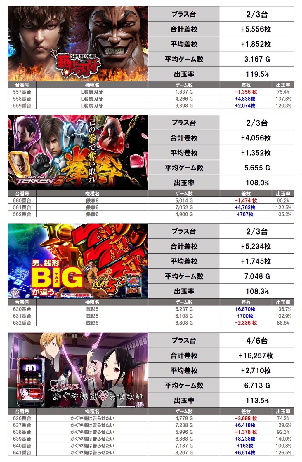 「範馬刃牙」「鉄拳6」「銭形5」「かぐや様は告らせたい」の4機種をpick up。平均差枚は+2,074枚、平均出率111.8%となった。
