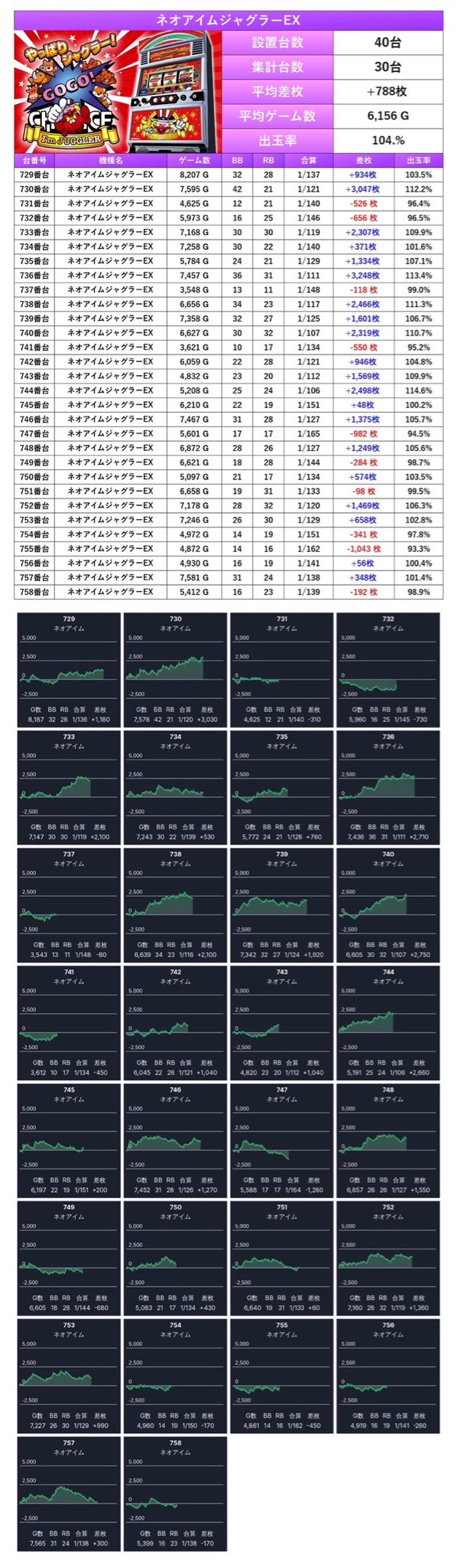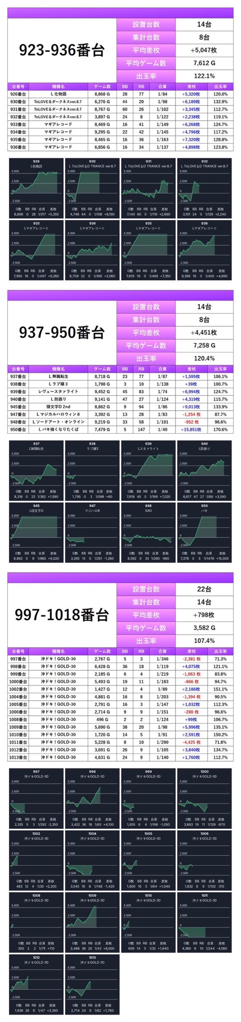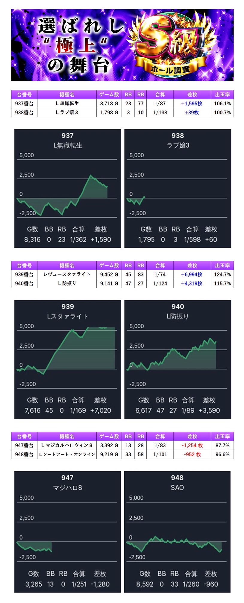 列ニブイチは6箇所のpick up。平均差枚+2,953枚、出率115.4%と非常に優秀な結果に。列単位での分かりやすい仕掛けが機能しており、立ち回りやすい環境が整っていた。