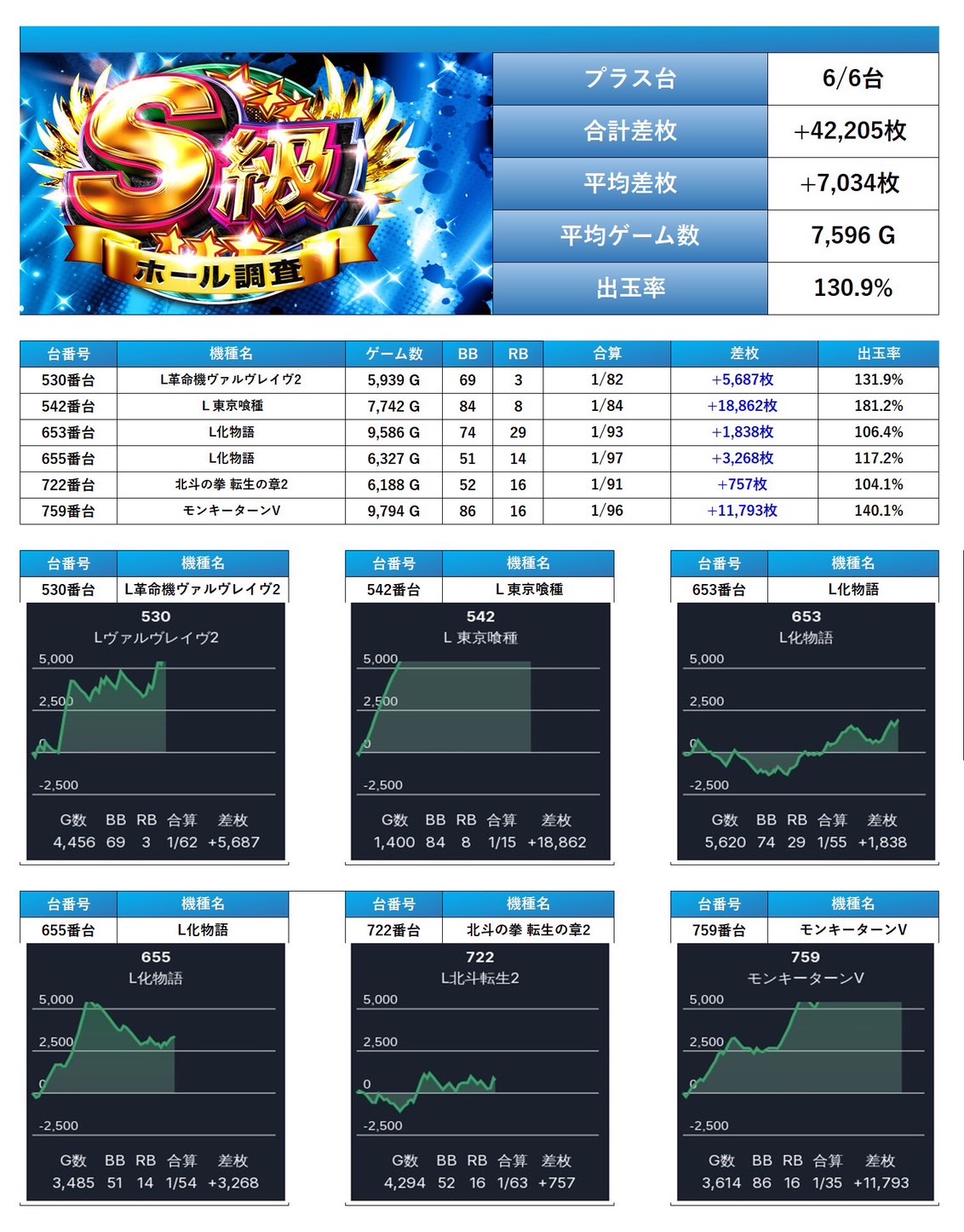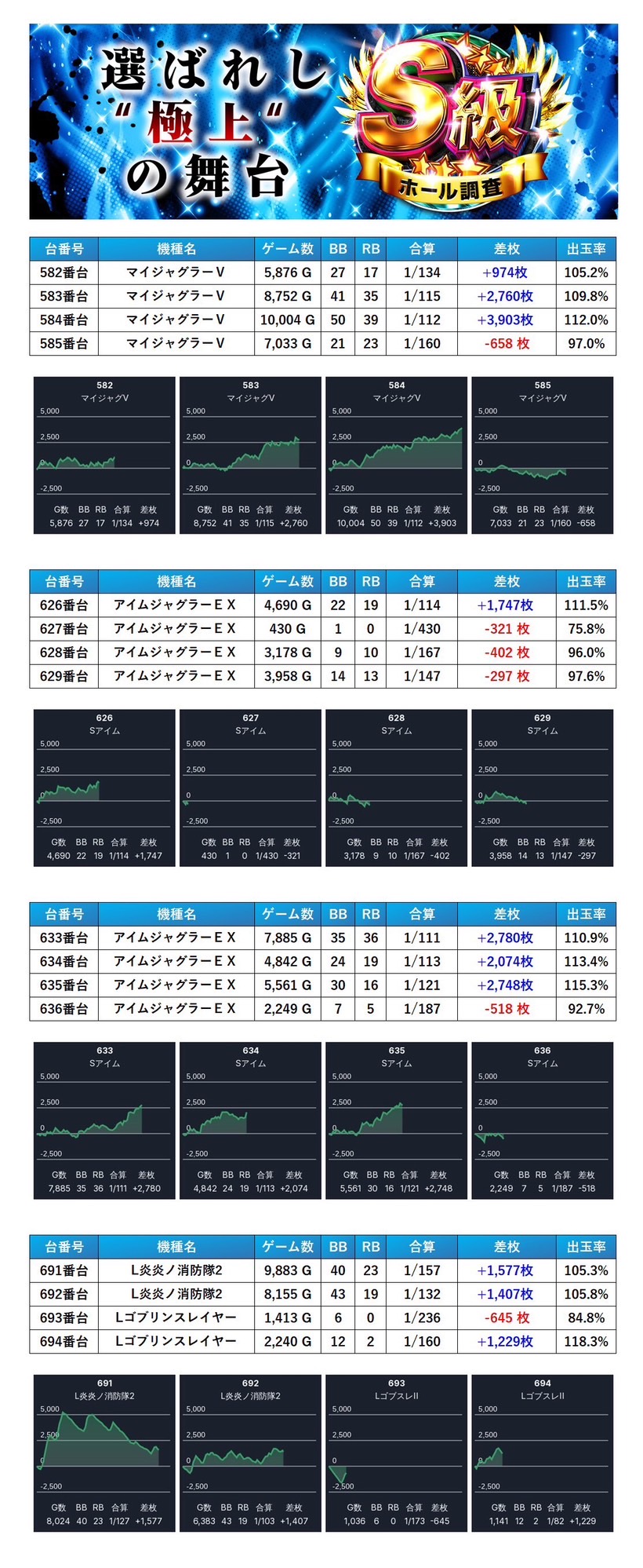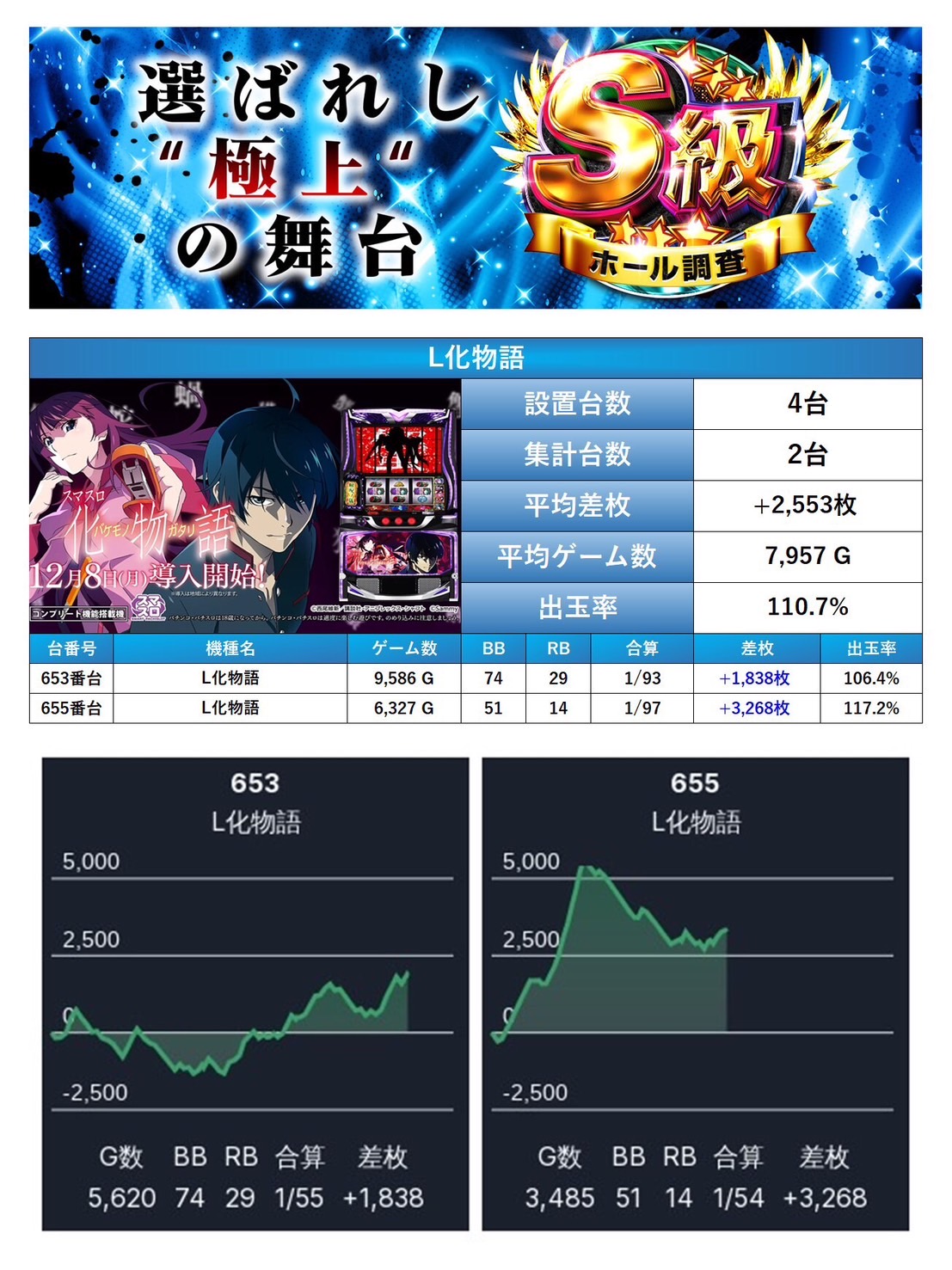 12回目となるS級ホール調査-青-は朝から抽選101名/一般68名とたくさんのユーザーが足を運んでくれた。メイン機種の圧倒的な爆発力が際立つ一方で、全体差枚はわずかなプラスに留まり、ややメリハリの強い内容となった。ピックアップ箇所の内容自体は良好で、特にメインのインパクトは高く評価できるが、その他の仕掛けでは打ち込みがやや控えめな箇所も目立ち、ポテンシャルを発揮しきれていなかった。それでもユーザープラスを確保している点や、狙い所の分かりやすさは評価でき、総合的には二つ星評価が妥当な内容と言えるだろう。今後はこの強さを維持し、全体へ広げられれば三つ星獲得も近いだろう。期待している。