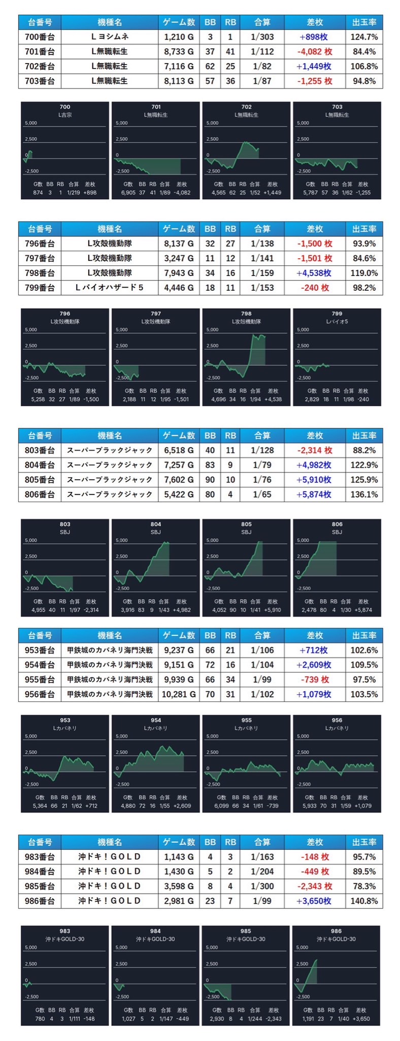平均差枚+7,034枚、出率130.9%と圧巻の結果を記録。台数は少ないものの、強烈な出玉が付いており、狙い撃ちが決まれば大きなリターンが期待できる内容だった。