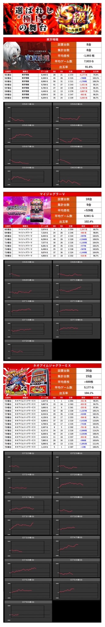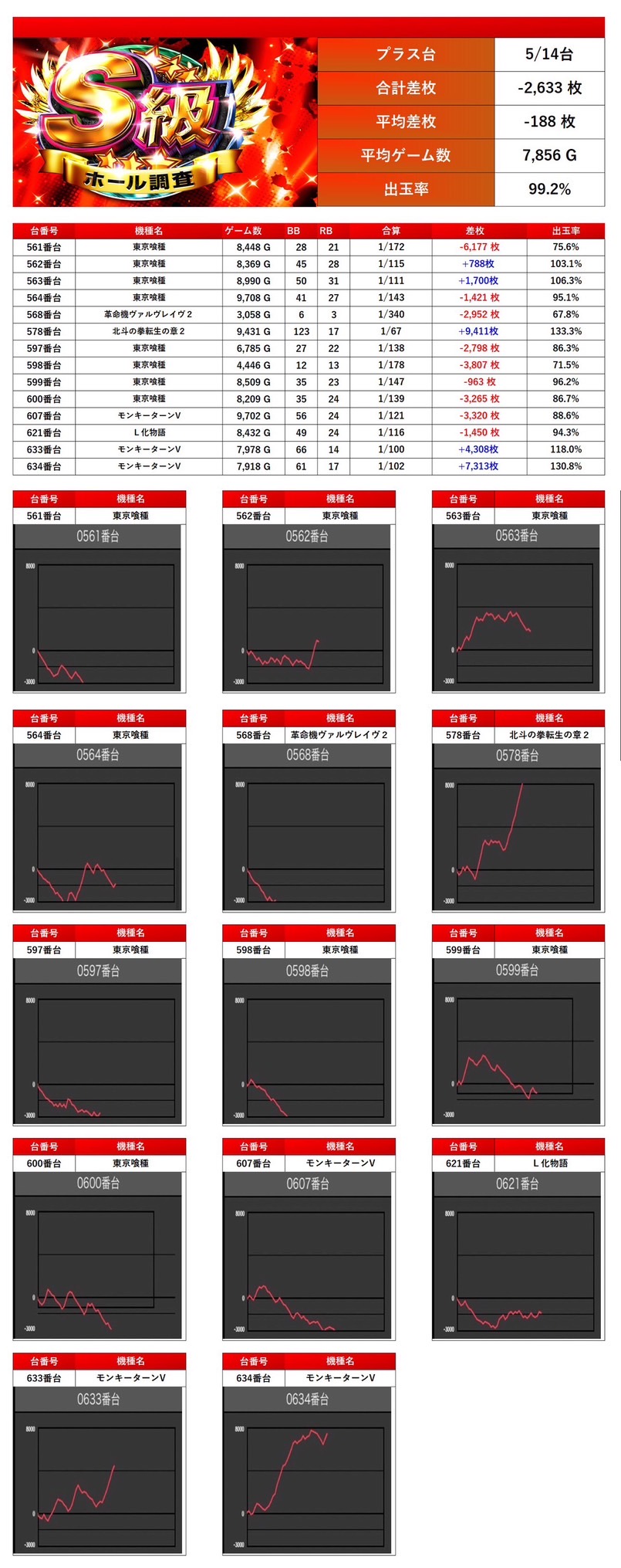 メイン優秀台は14台がpick up。平均差枚-188枚、出率99.2%とマイナスに。軸となるべきポイントが振るわず、全体結果にも影響を与える形となった。