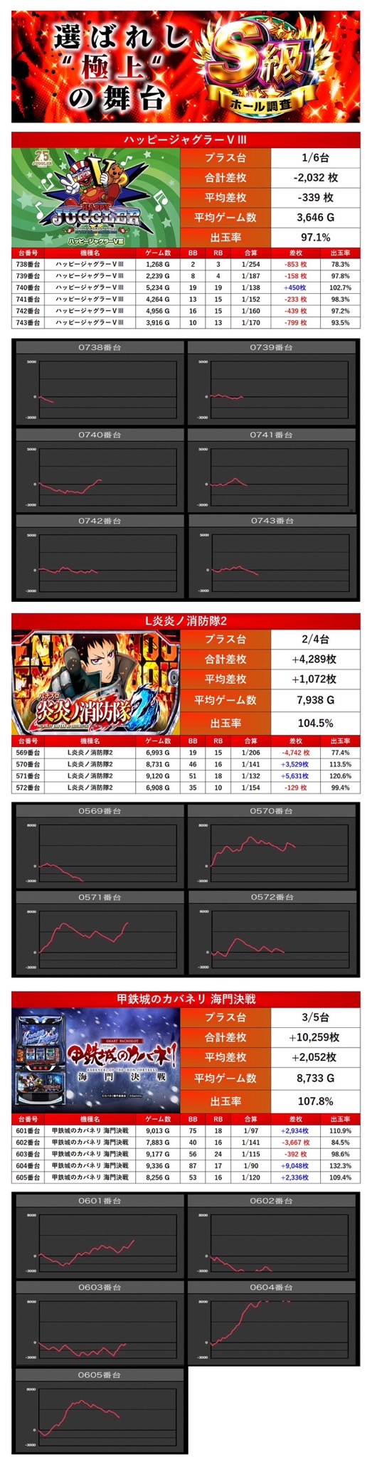 「ハッピージャグラーVⅢ」「L炎炎ノ消防隊2」「甲鉄城のカバネリ 海門決戦」の3機種15台がpick up。