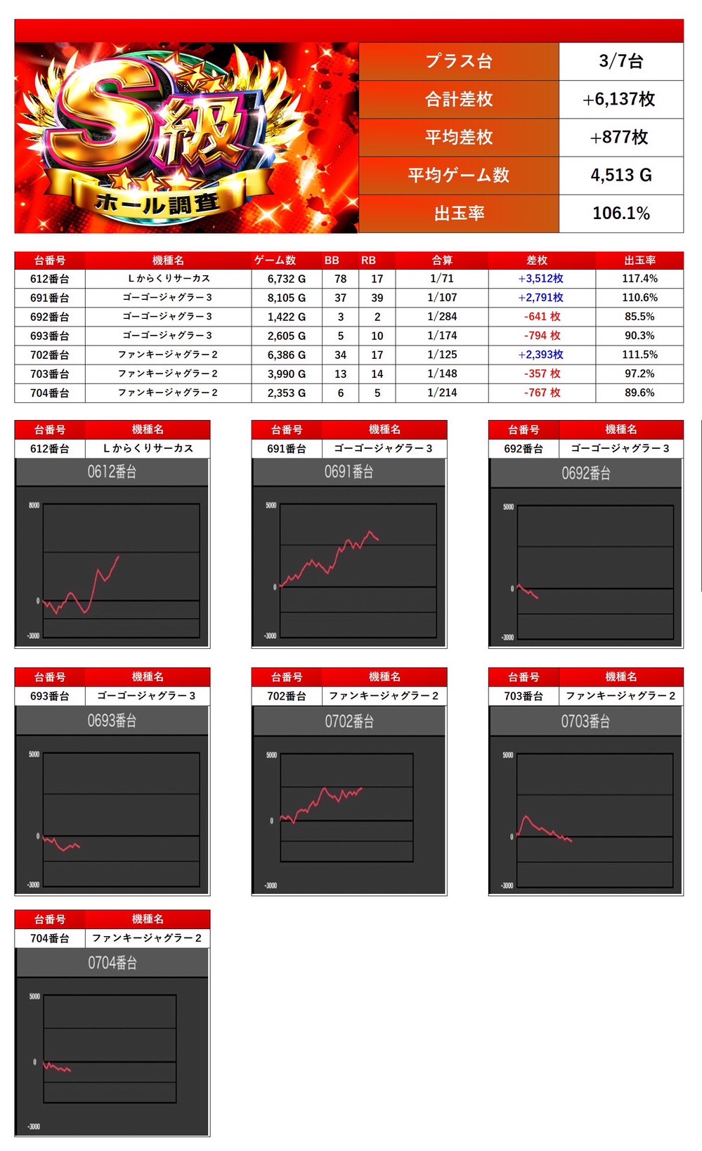 平均差枚+877枚、平均出率106.1%となった。
