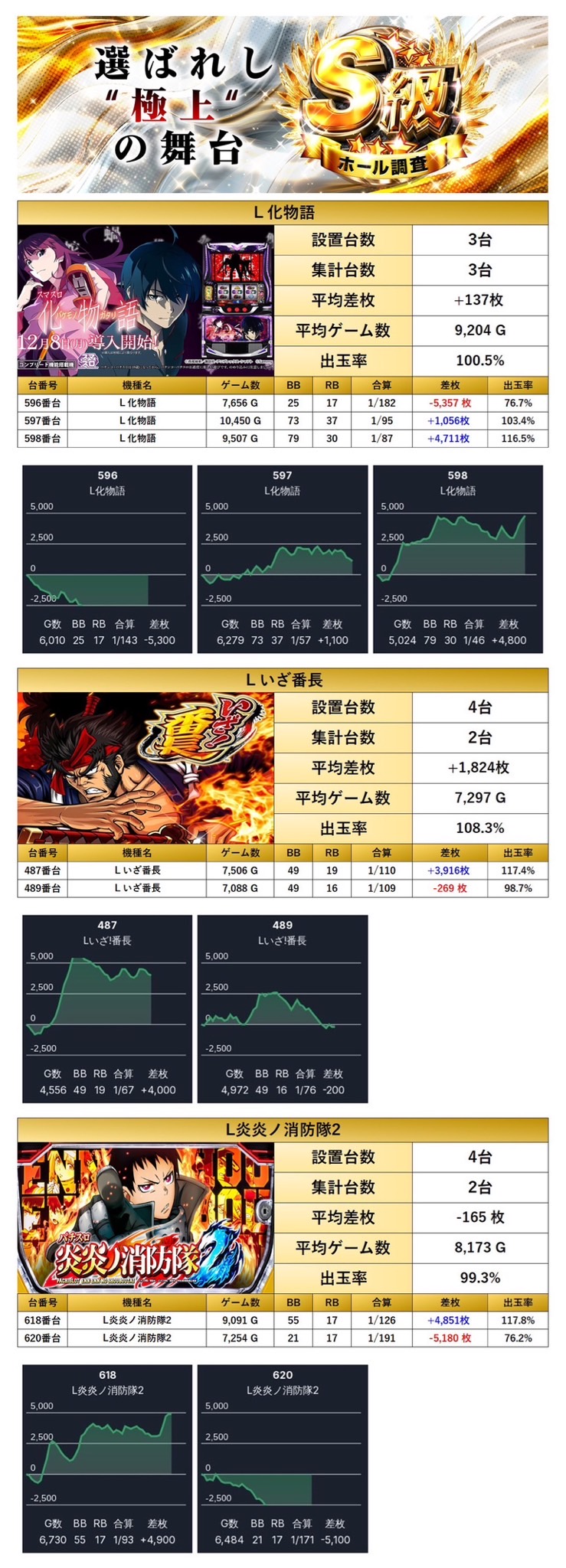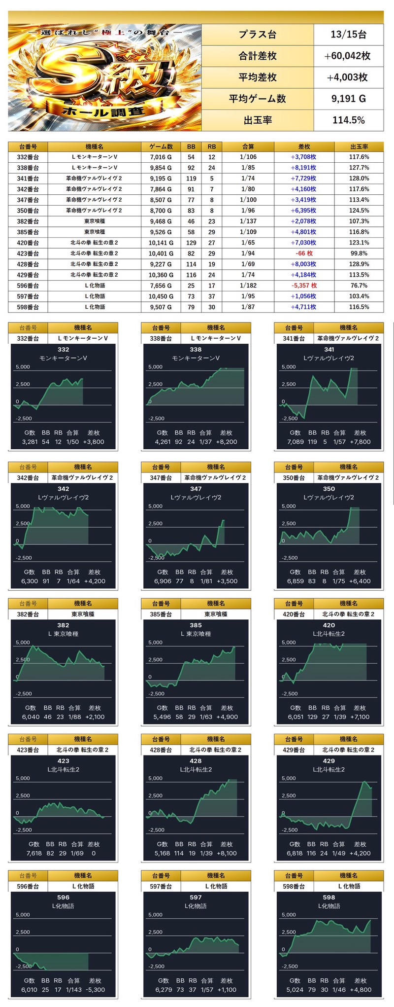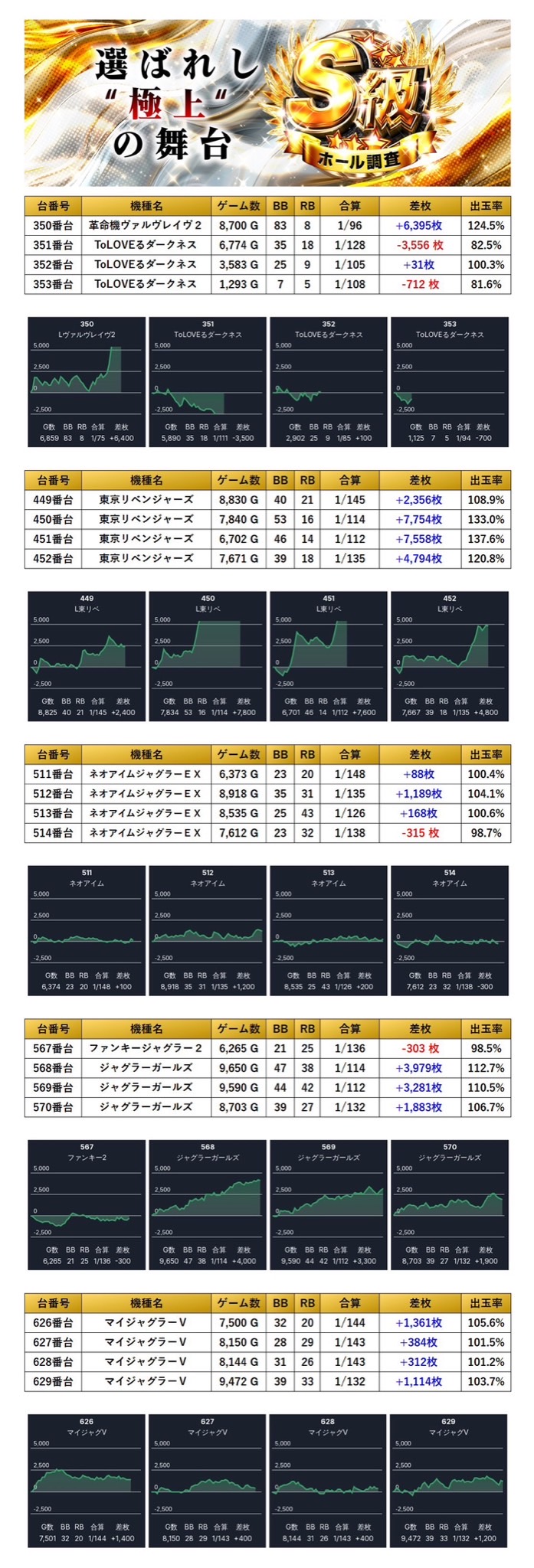 4回目の開催となるのS級ホール調査-極-は、pick up率24.6%と非常に高い仕掛け量に加え、対象になった機種の平均差枚+2,773枚と質の高さも兼ね備えた優秀な内容となった。特にメイン機種や4台設置機種、単品の強さが際立っており、メリハリのある配分で多くの勝ち筋が用意されていた印象。一方で全台系やニブイチはやや控えめではあったが、それを補って余りある圧巻の出玉が多数存在していた。総差枚でもしっかりとユーザープラスを記録しており、総合的に見て三つ星評価に相応しいハイレベルな営業だったと言える。次回の開催にも期待が高まる。