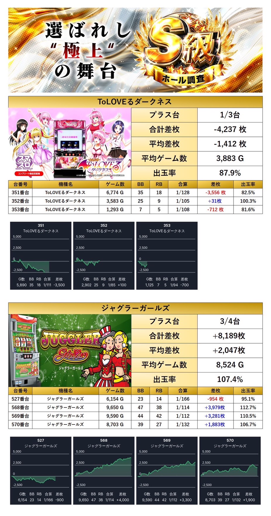 「ToLOVEるダークネス」「ジャグラーガールズ」の2機種7台がpick up。平均差枚+565枚、出率102.7%とToLOVEるでは打ち込みが足りず、やや控えめな結果に留まった。