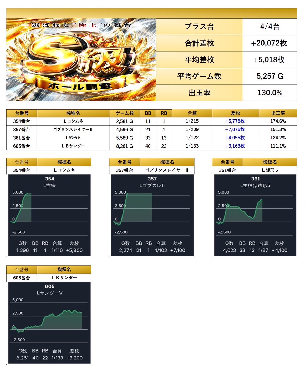 対象から4台がpick up。平均差枚+5,018枚、出率130.0%と圧倒的な数値を記録し、強烈な出玉感を演出していた。