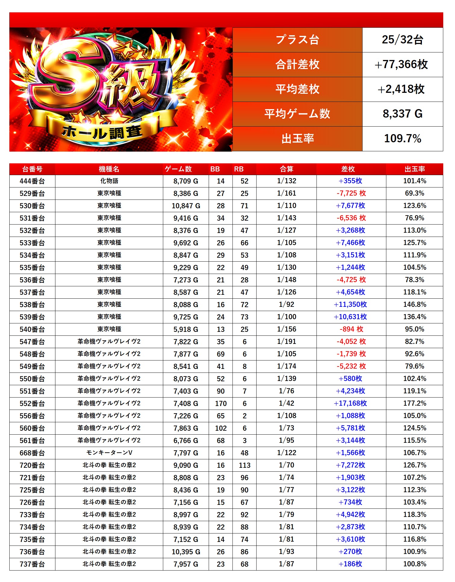 今回のS級ホール調査 -赤-では、全体でのpick up率は16.5%と多彩なラインナップになっていた。全体差枚は+51,928枚/平均+164枚としっかりプラス、さらにメイン・全台系・ニブイチといった主要ポイントがいずれも安定した結果を残しており、バランスの良さが際立つ一日となった。広い範囲でチャンスが用意されており、どこからでも狙える安心感のある構成。安定感重視の内容としては十分評価できる仕上がりとなっていた。大きなインパクトが加わればさらに上を狙えそうなポテンシャルも感じられ、今回は二つ星評価とする。次回の開催にも期待が高まる。