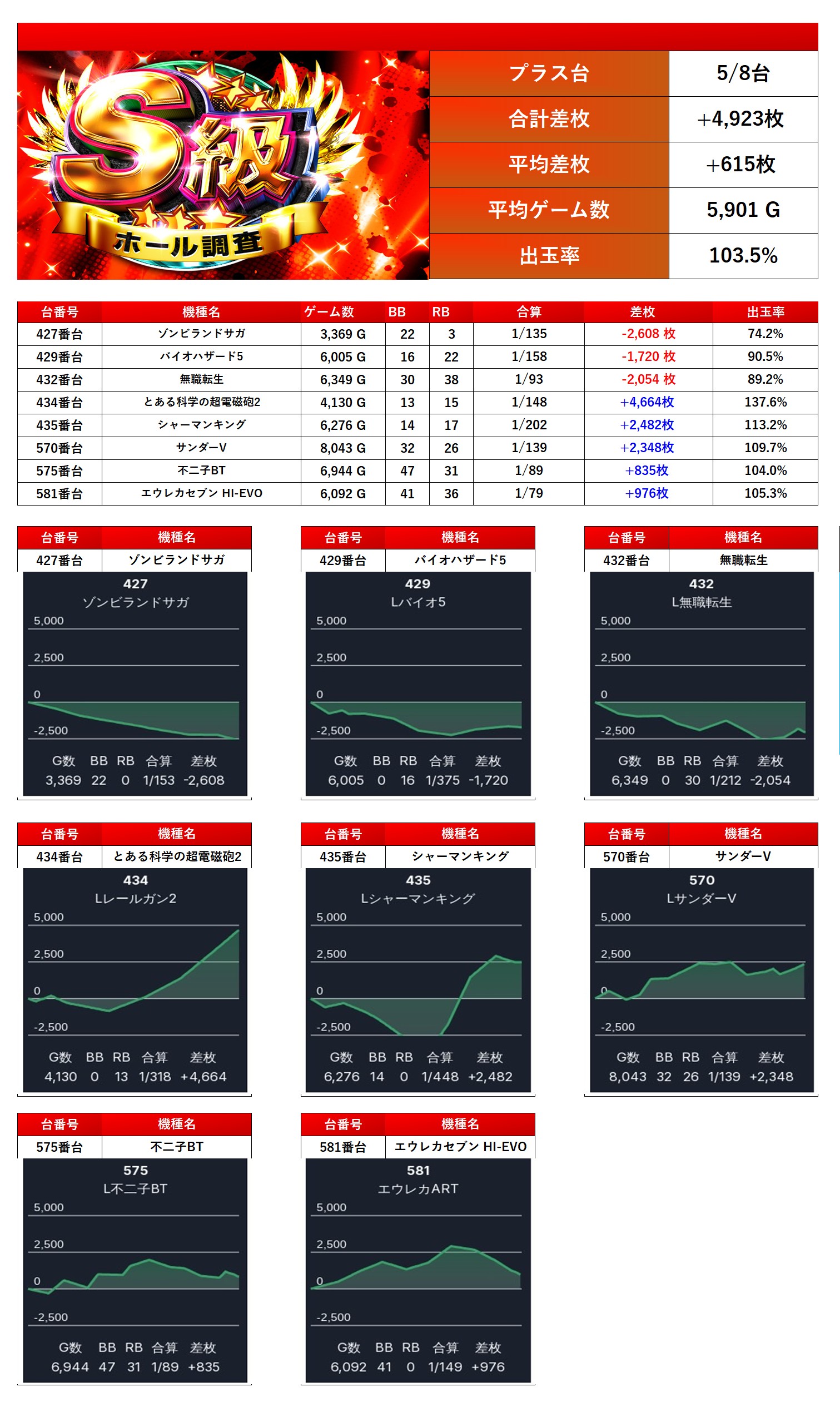 平均差枚+615枚、出率103.5%とプラスではあるものの、やや落ち着いた結果となった。