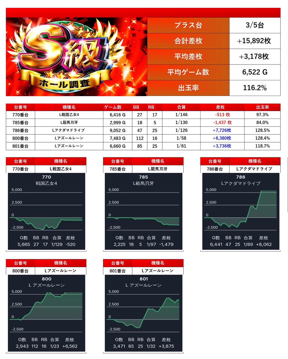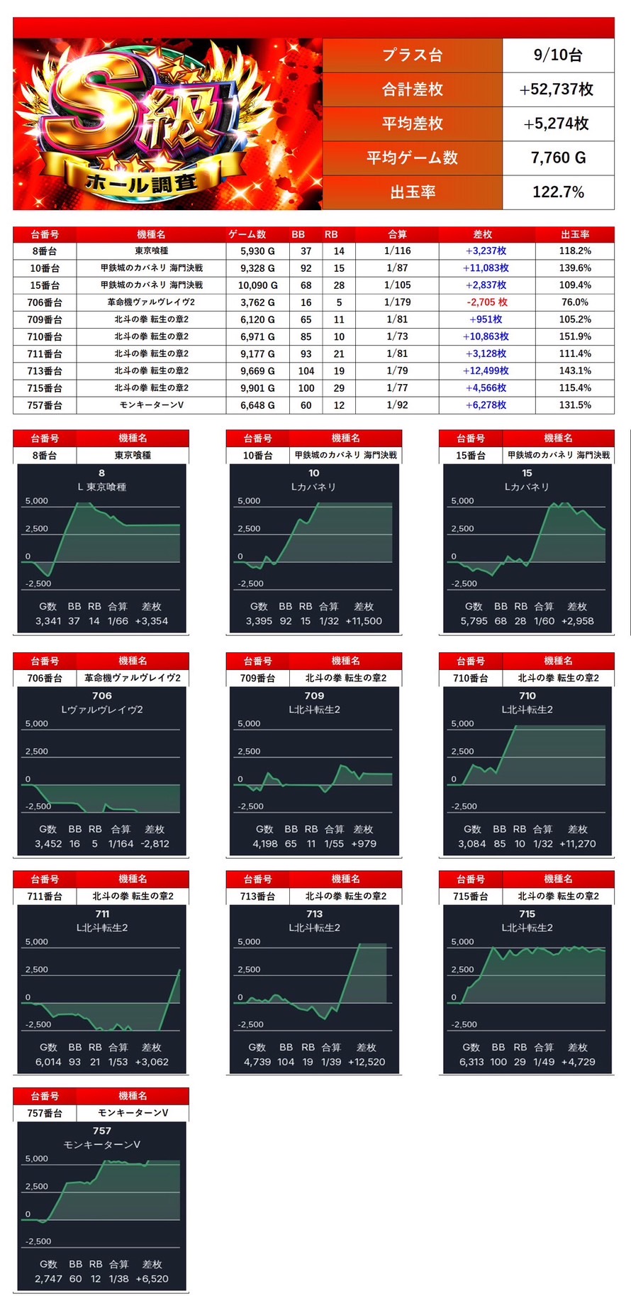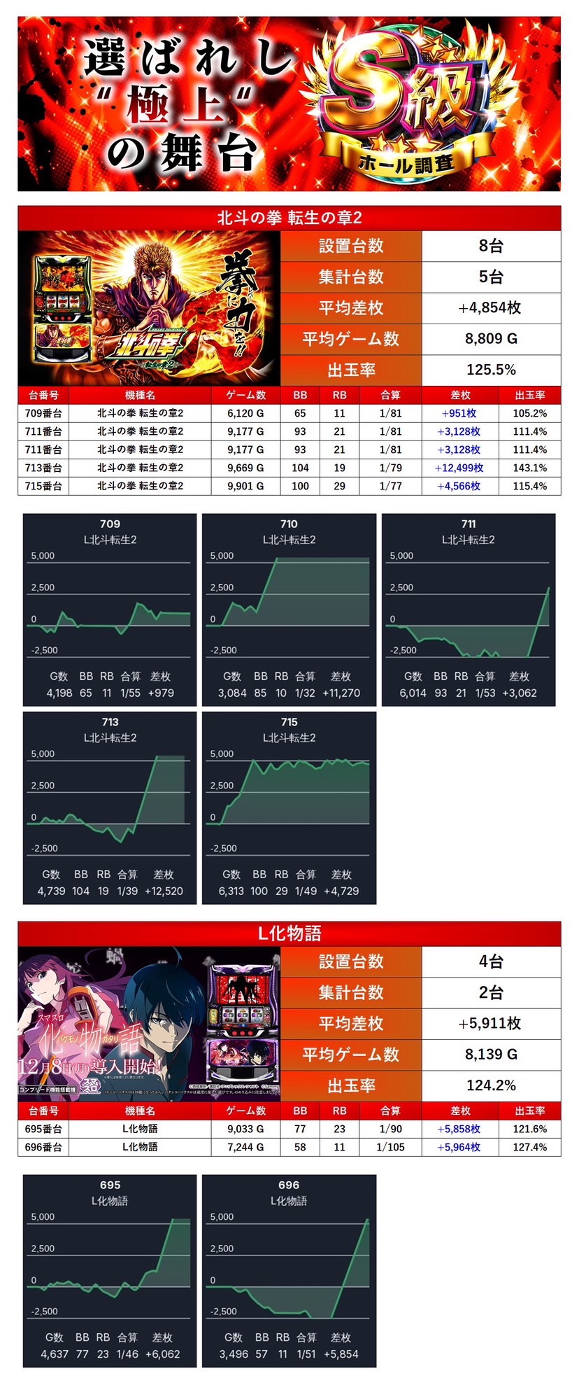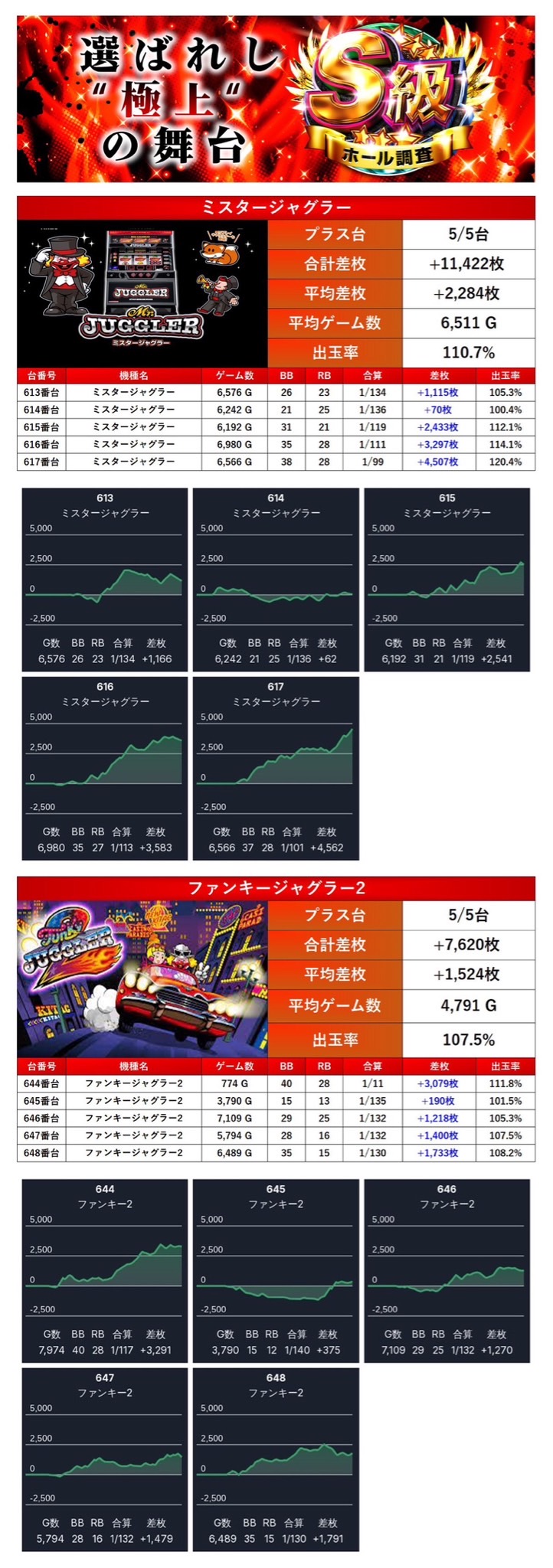 今回のS級調査‐赤‐ではpick up率は11.0%となっていた。総差枚+66,738枚/平均+294枚と圧巻の出玉でベースの高さが感じられる結果となった。仕掛けの投入量こそ多くはないものの、ピックアップ箇所の出率・質が非常に高く、しっかりと結果に繋がっていた印象。特にメインやニブイチの出玉力は圧巻で、狙い所を見極められれば大きなリターンが期待できる環境となっていた。仕掛けが抜群の反応を見せ一撃性だけでなく、計測的に好挙動の台が多数見られた。全体差枚もプラス着地と文句のない内容で、安定感と出玉力のバランスが非常に良好。対象になった機種も人気機種からノーマル機までバランスの取れた構成で派手さと安定感を兼ね備えた内容だった。今回も納得の三つ星評価で3連続達成となった。次回も期待している。