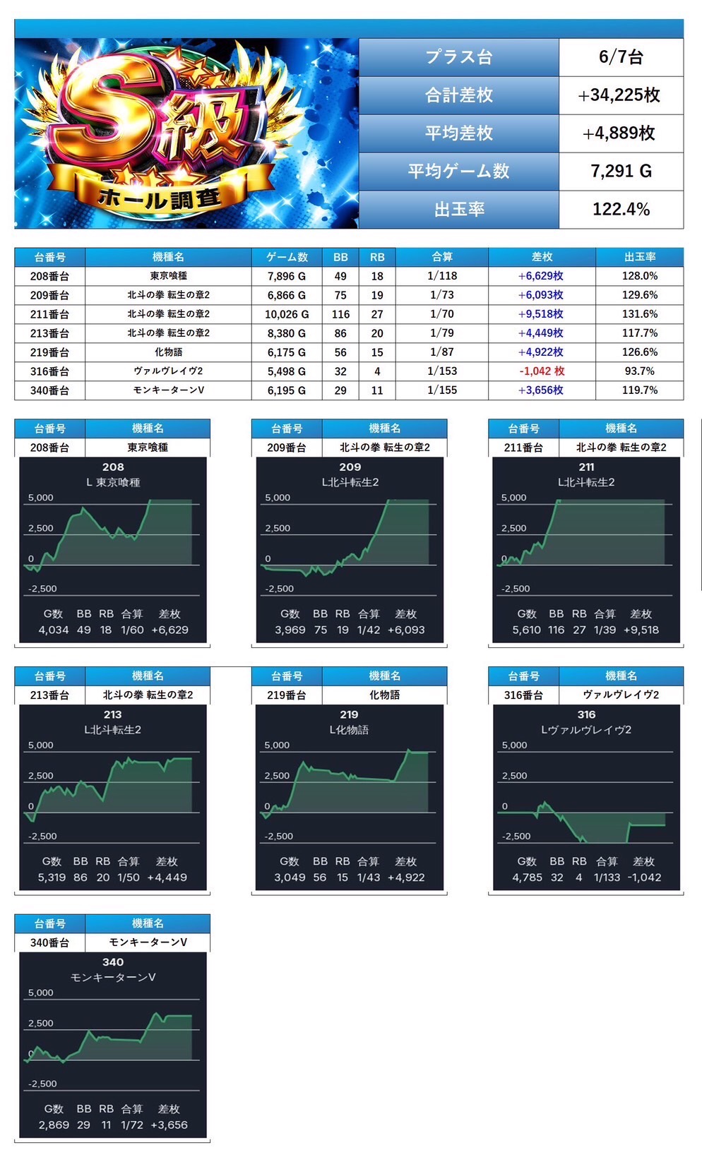 3回目の開催となったS級ホール調査‐青‐では全体差枚は17,116枚/平均+44枚とプラス域に終えることが叶い、メイン機種とニブイチの圧倒的な爆発力が際立つ内容となった。pick up率は10.2%と絞られているものの、その分仕掛けの質は非常に高く、特にメインとニブイチにおける圧巻の出玉でインパクトは三つ星評価に相応しい仕上がり。並びでは回転数が足りず、やや落ち着いた結果ではあったが、多彩な機種が用意されており、狙いを絞ることでしっかりと勝負できる環境が整っていた。今後も同様の高水準な営業に期待したい。