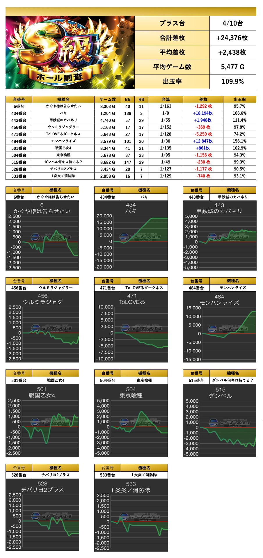 4台以上設置機種とそれ以外から優秀台を探すと10台をpick upする事ができた。10台の平均差枚は+2,438枚で平均出率が109.9%だった。
