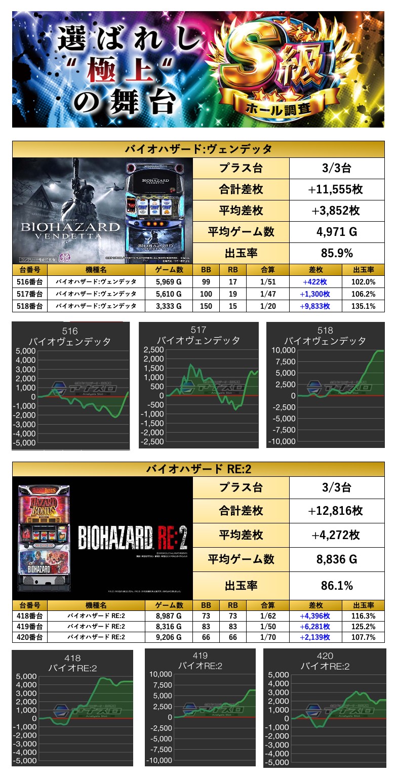 「Lバイオヴェンデッタ」「SバイオRE2」の2機種をpick upする。2機種6台の平均差枚は+4,062枚で平均出率が116.4%だった。