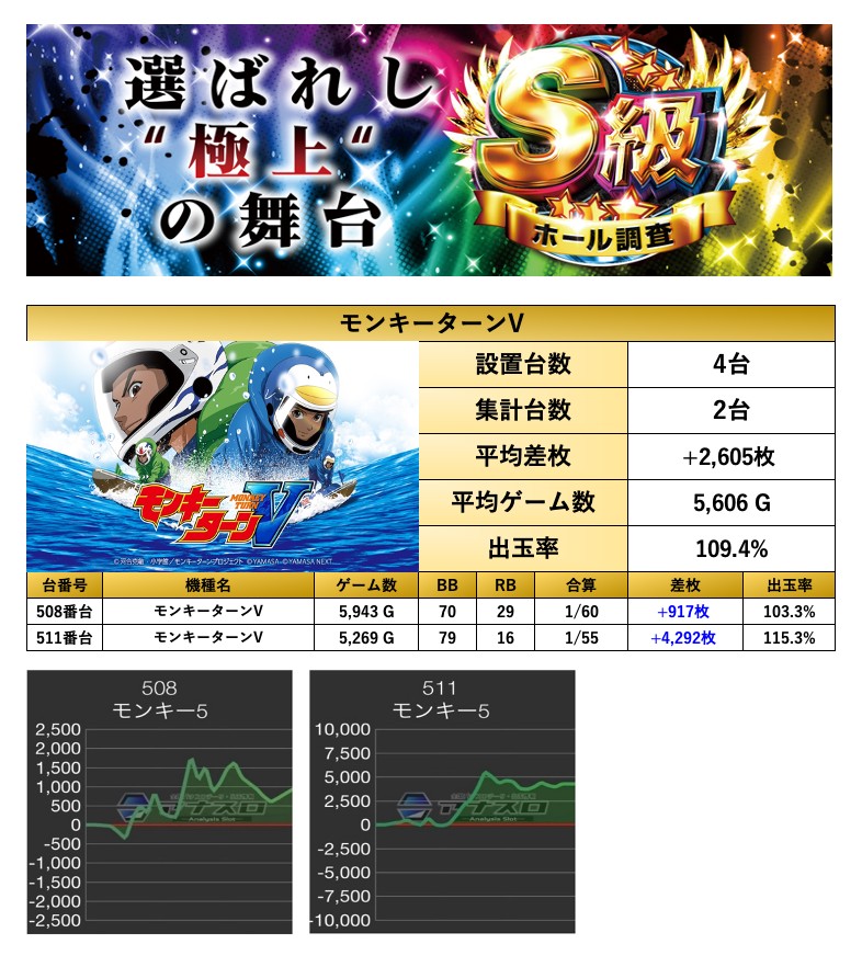 最優秀台でも紹介した「モンキー」の1機種をpick upする。1機種2台の平均差枚は+2,605枚で平均出率が109.4%だった。