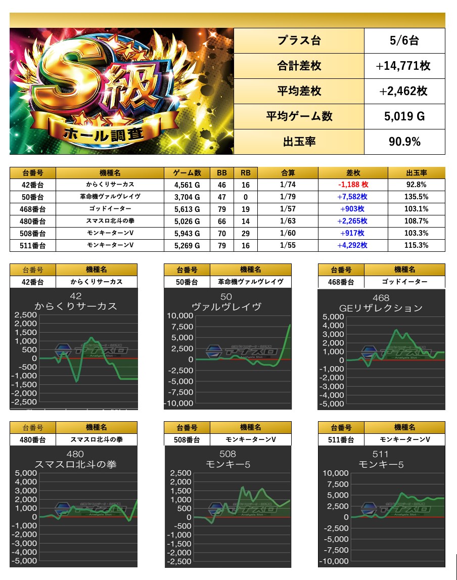 「ヴヴヴ」「からくり」「北斗」「ゴットイーター」「モンキー」の5機種から6台の最優秀台をpick upする。5機種の設置台数が44台であるため最優秀台比率は14%となった。6台の平均差枚は+2,462枚で平均出率が110.0%だった。