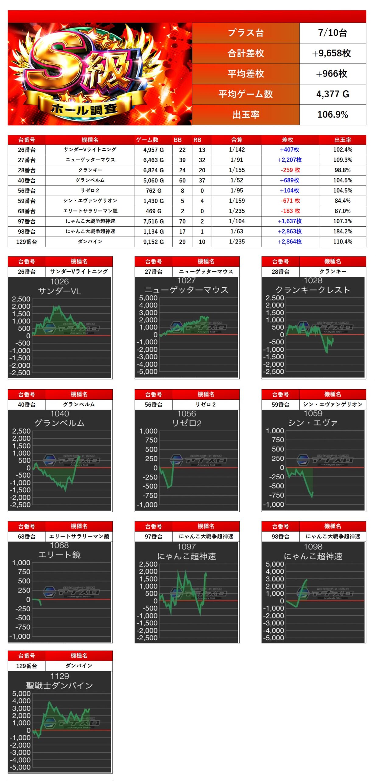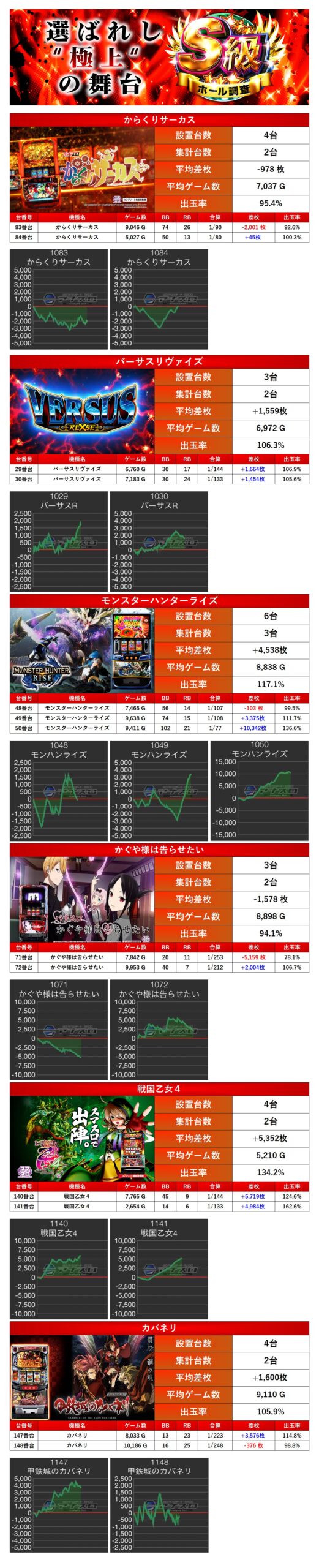 11回目の開催となったS級調査-赤-は抽選から117名のユーザーが訪れた。今回の仕掛けの目玉は設置の半分機種だろう。対象のpick upが6機種もあった。メインの5機種も毎回約1/4でのpick upで安定感がある。出率と総合して今回は二ツ星評価となる。並び人数に対して仕掛け量は豊富にあるので狙いは付けやすいだろう。今後の調査も期待していく。