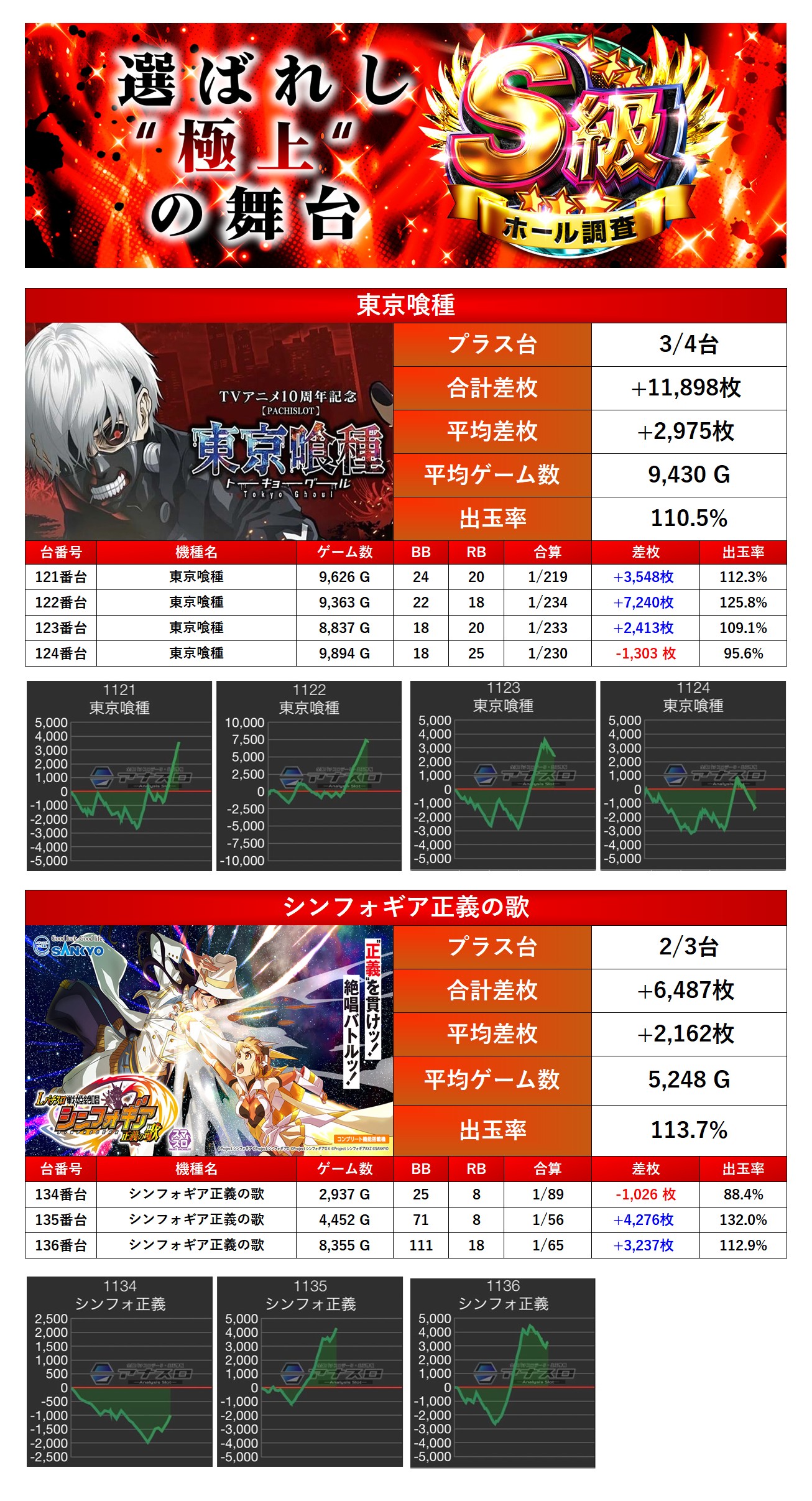 「東京喰種」「Lシンフォギア」の2機種をpick upする。2機種7台の平均差枚は+2,626枚で平均出率が111.5%だった。