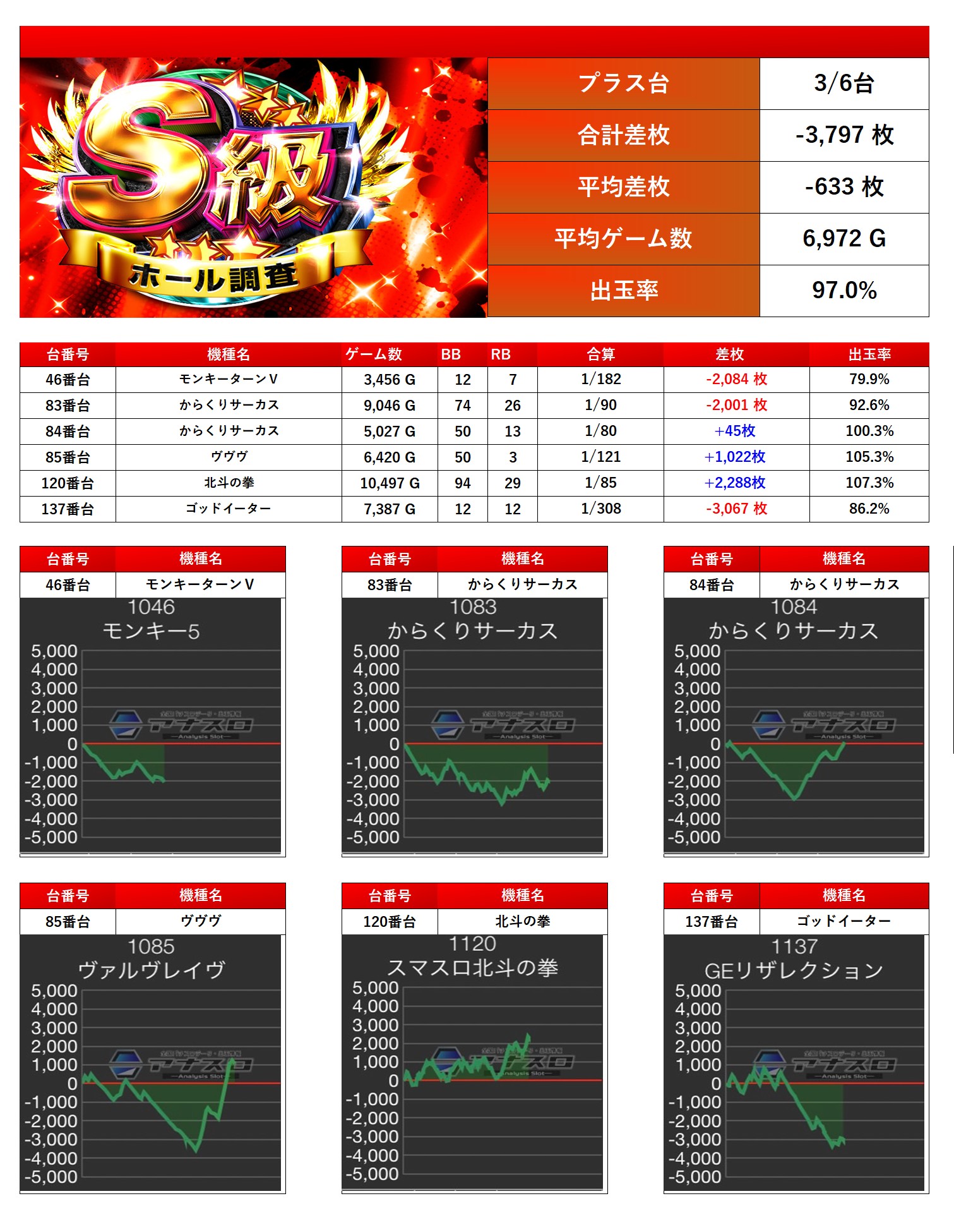 「北斗」「モンキー」「からくり」「ヴヴヴ」「ゴッドイーター」の5機種から6台の優秀台をpick upする。5機種の合計台数が25台なので比率で約24%が優秀台だった。6台の平均差枚は-633枚で平均出率が97.0%だった。