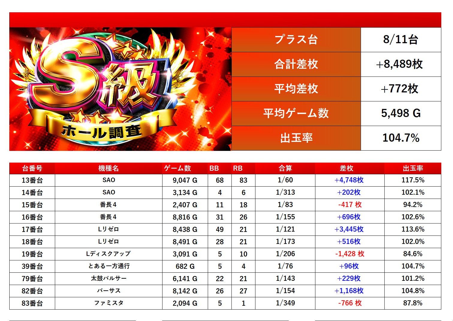 対象から11台をpick upする。11台の平均差枚は+772枚で平均出率が104.7%だった。