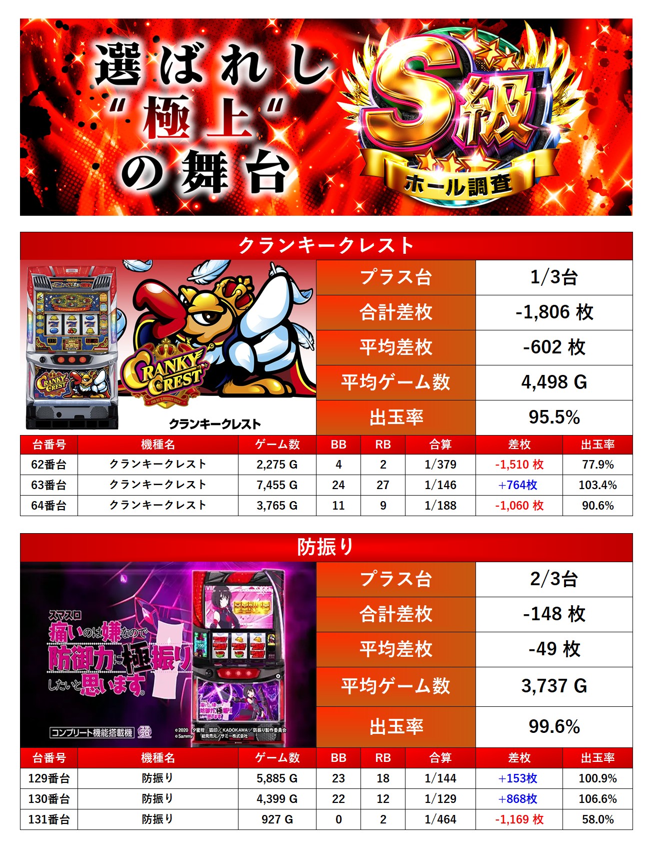 「クランキークレスト」「防振り」の2機種をpick upする。2機種6台の平均差枚は-326枚で平均出率が97.4%だった。