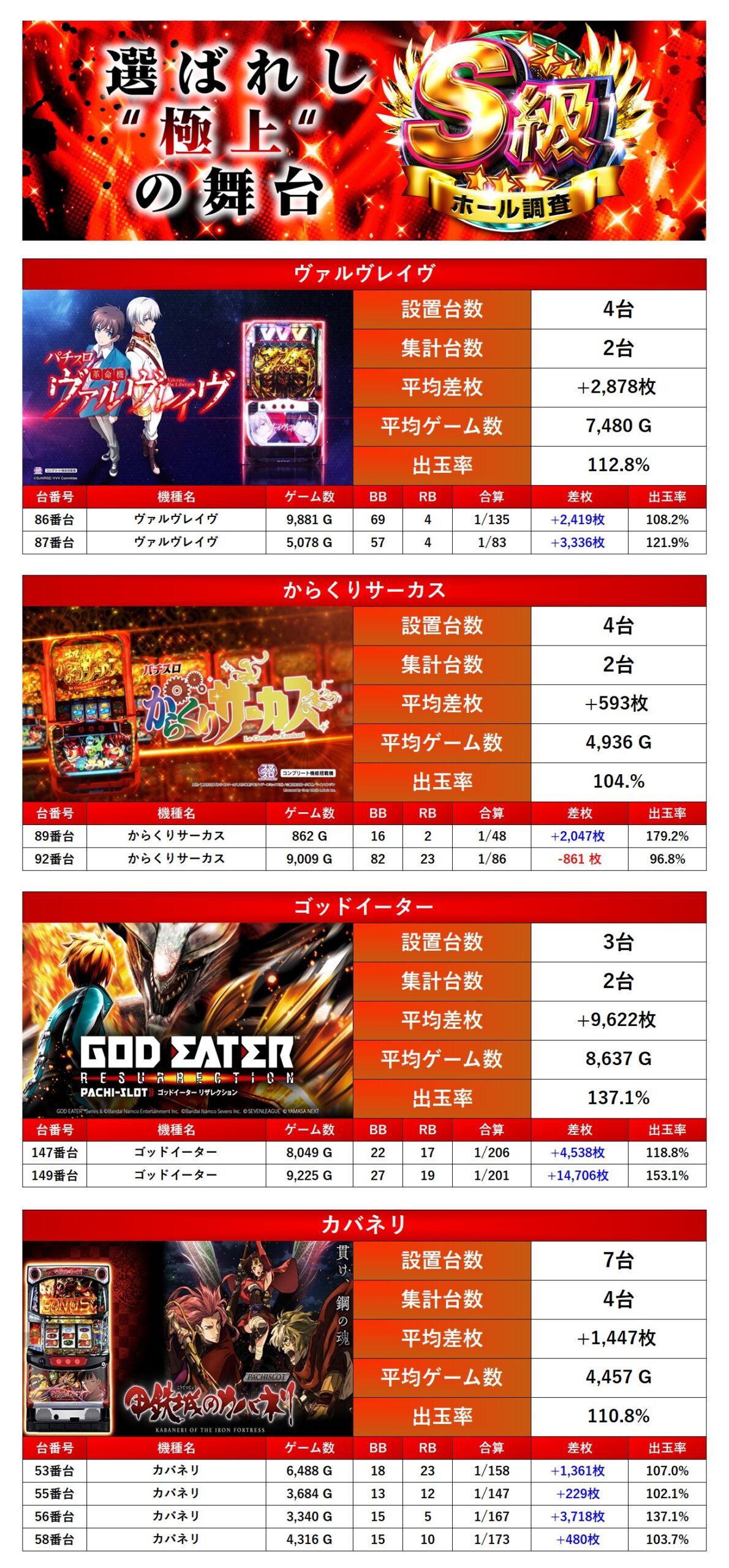 メイン機で紹介した「ヴヴヴ」「からくり」「ゴッドイーター」更には「カバネリ」の4機種をpick upする。4機種10台の平均差枚は+3,197枚で平均出率が120.6%だった。