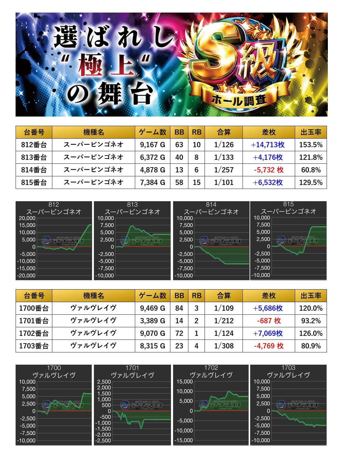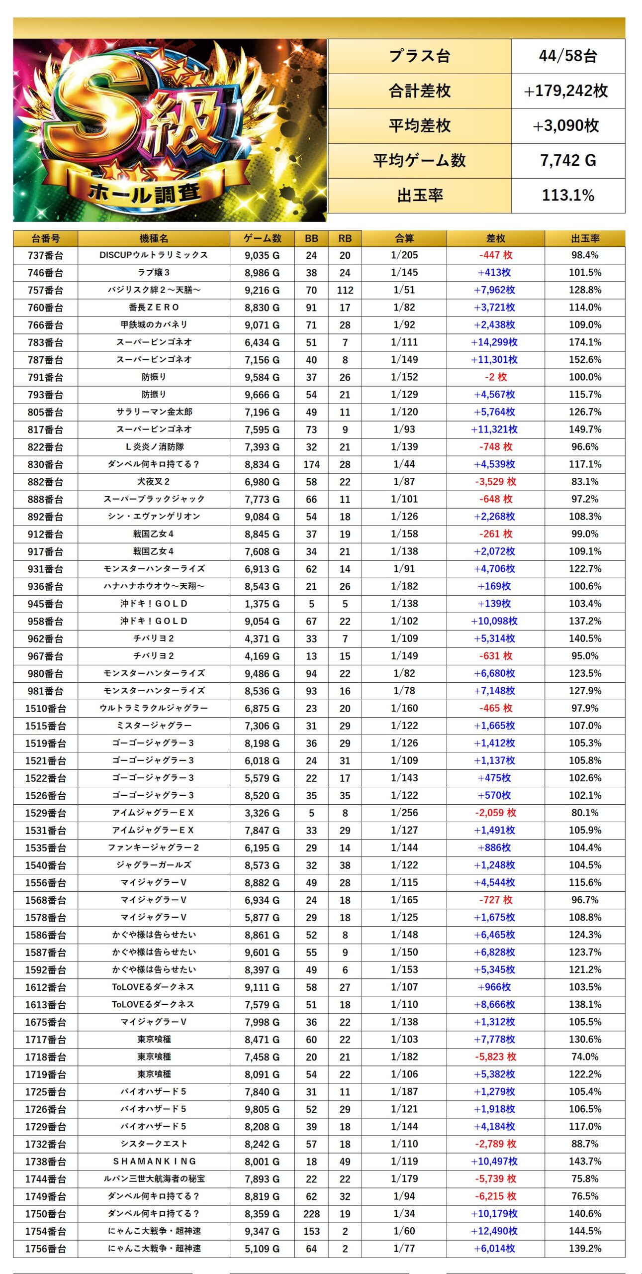 4回目のS級調査-虹-は抽選から562名ものユーザーが訪れた。各仕掛けの量と内容も素晴らしく、全館の総差枚が+115,232枚で台平均+205枚と圧巻の出玉だった。平均ゲーム数も4,981Gとなり、どんな抽選番号でも戦える状況であったと推測する。総合して最高評価の三ツ星にふさわしい。今後も三ツ星獲得を継続してもらいたい。