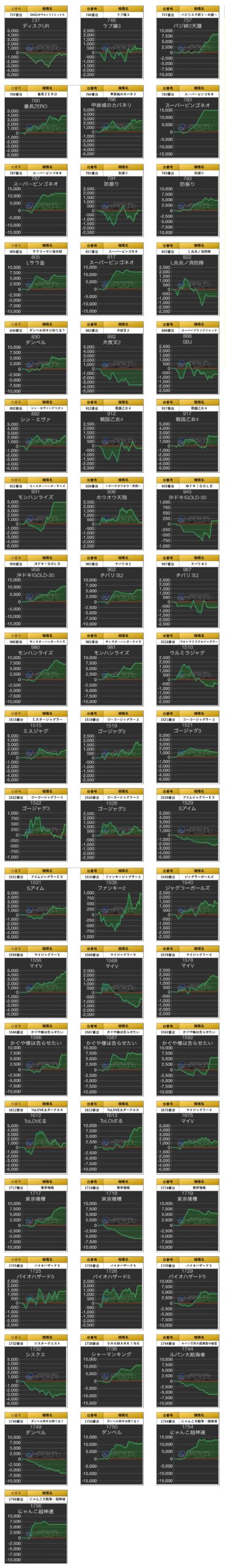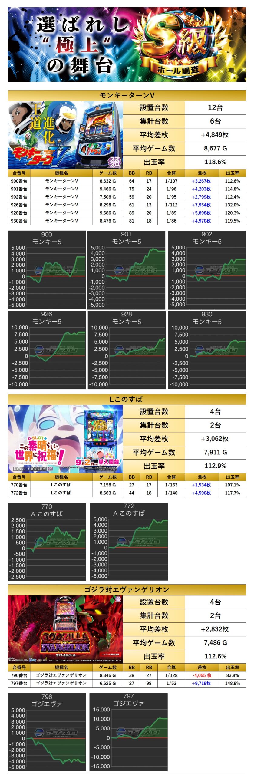 優秀台でも紹介した「モンキー」、更には「Lこのすば」「ゴジヱヴァ」「銭形」「バキ」「一方通行」「L番長」の7機種をpick upする。7機種21台の平均差枚は+4,195枚で平均出率が117.6%だった。