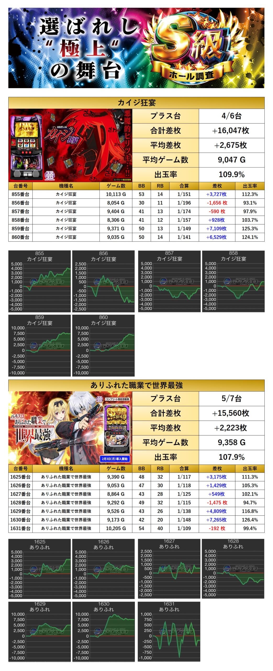 「カイジ」「ありふれ」の2機種をpick upする。2機種13台の平均差枚は+2,431枚で平均出率が108.8%だった。