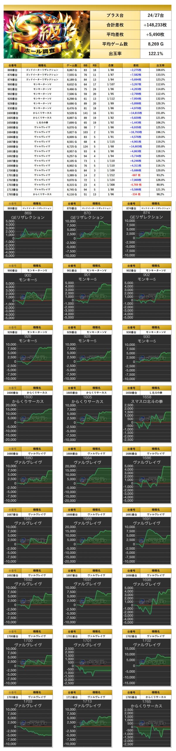 定番となった5機種「北斗」「ヴヴヴ」「からくり」「ゴッドイーター」「モンキー」から優秀台を27台pick upする。5機種の総台数は132台であるので、約20%が優秀台であった。27台の平均差枚は+5,490枚で平均出率が122.1%だった。