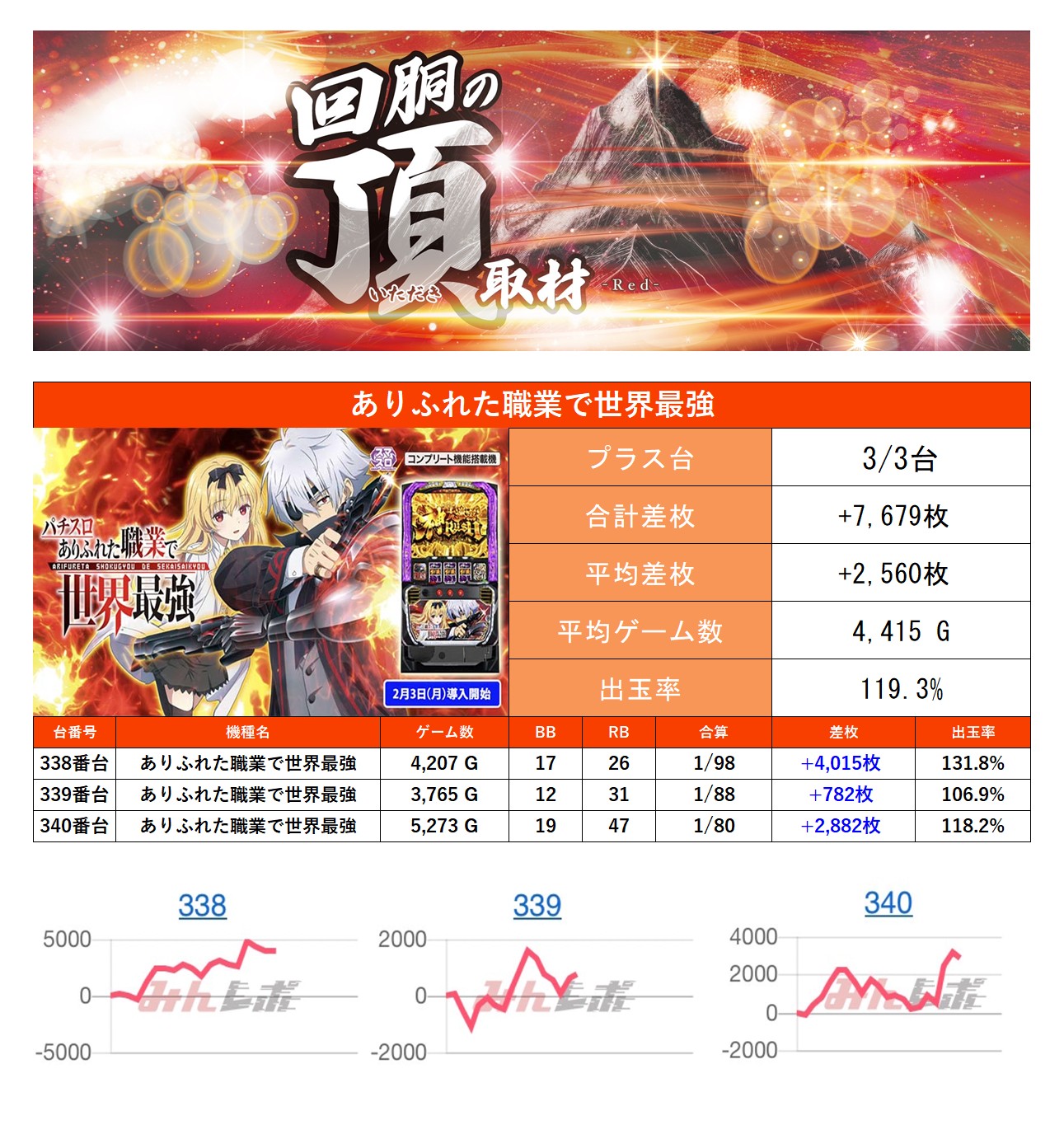「ありふれ」の1機種をpick upする。1機種3台の平均差枚は+2,560枚で平均出率は119.3%だった。