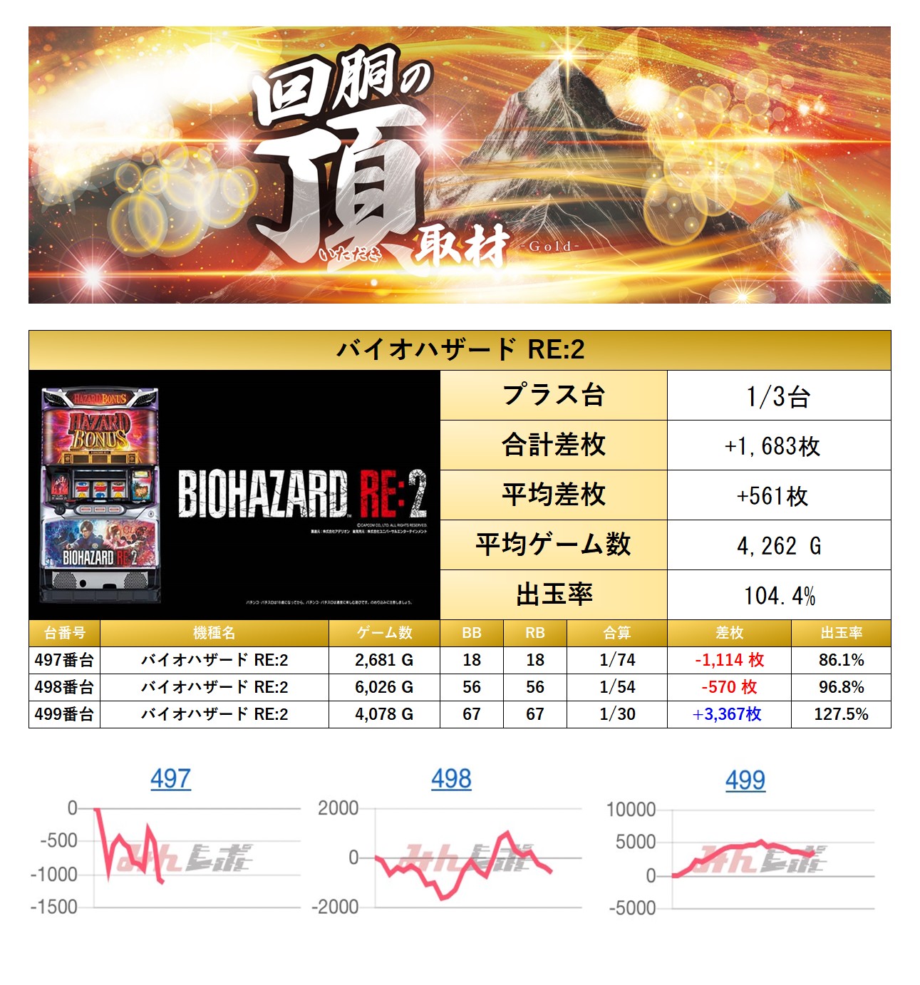 「SバイオRE2」の1機種をpick upする。1機種3台の平均差枚は+561枚で平均出率は104.4%だった。