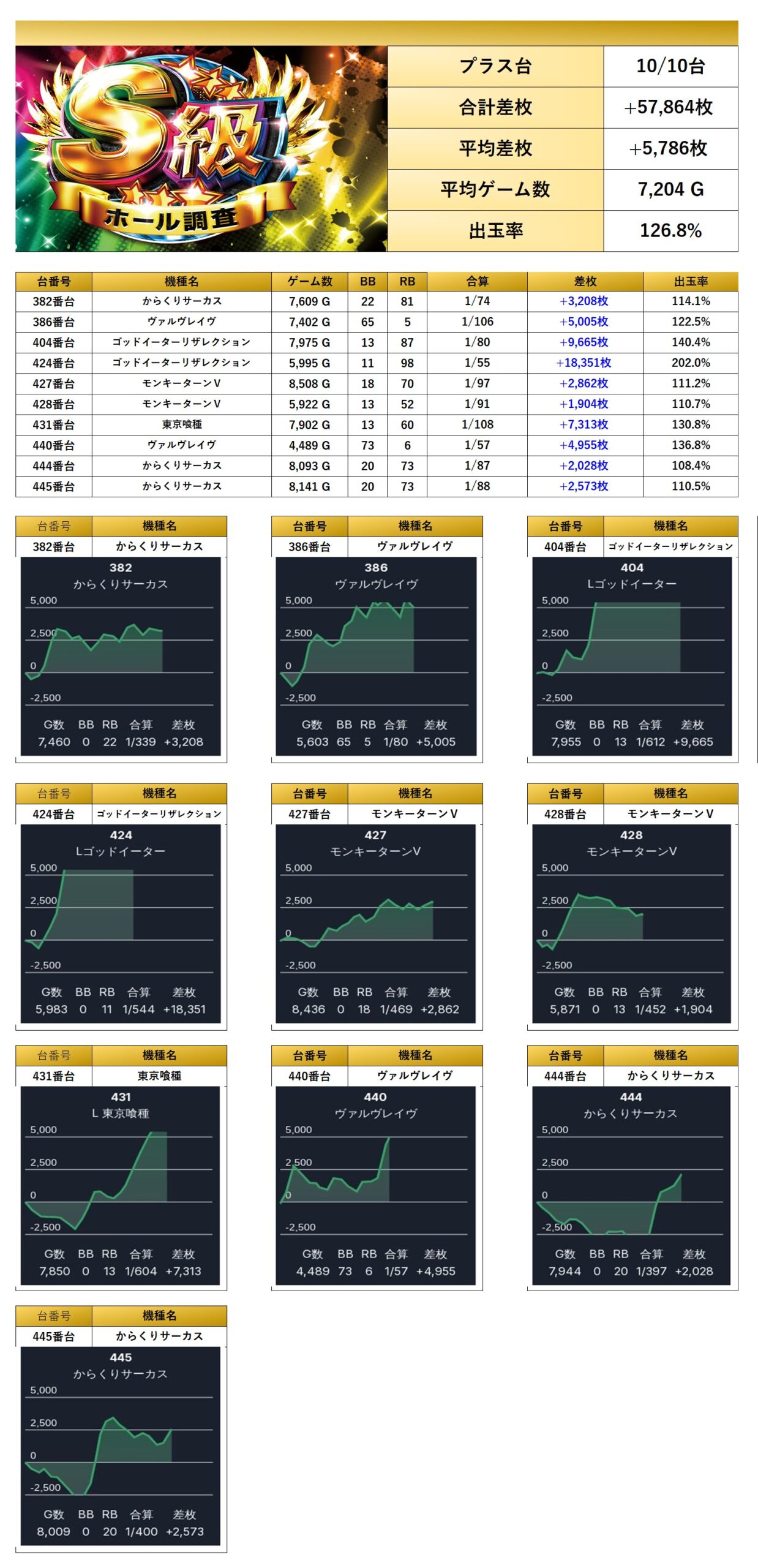 10台の平均差枚は+5,786枚で、平均出率は126.8%と驚きの高さに。