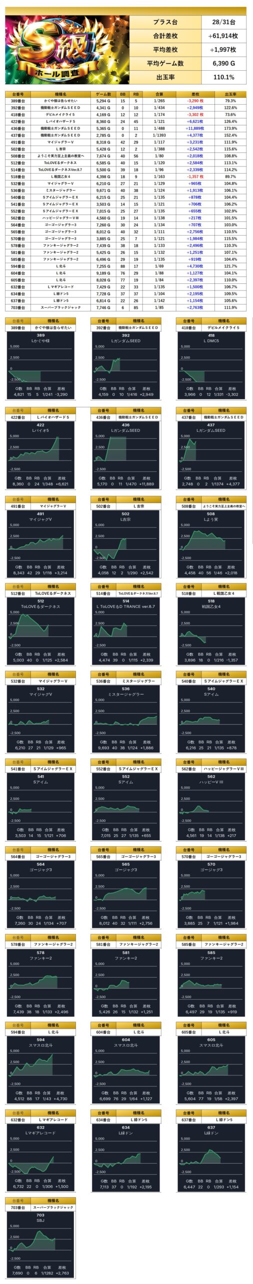これら全ての平均差枚は+1,997枚で、平均出率は110.1%となった。