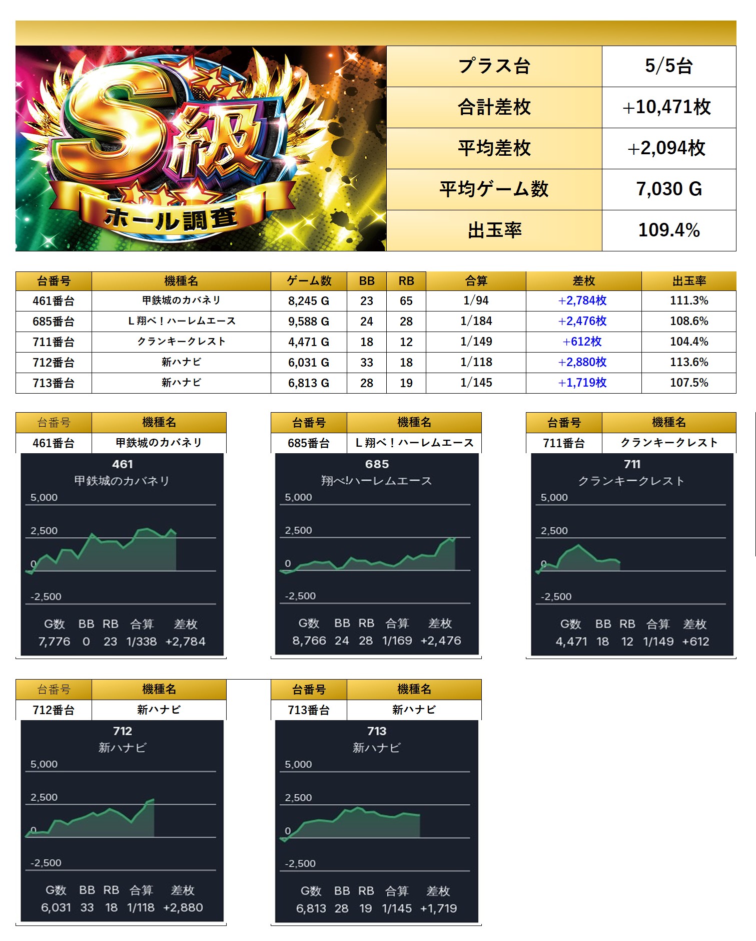 この日は5台がpick upされ、平均差枚は+2,094枚で、平均出率は109.4%を記録。