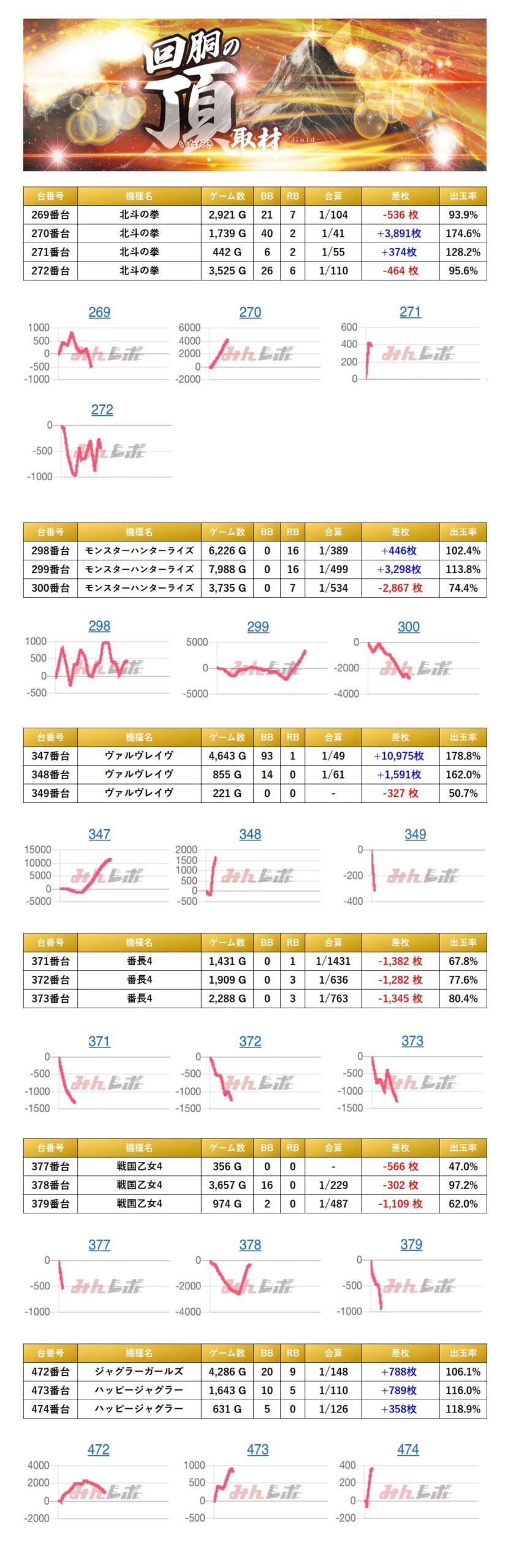 4台並びが1箇所、3台並びが5箇所、合計19台をpick upする。19台の平均差枚は+649枚で平均出率は108.3%だった。