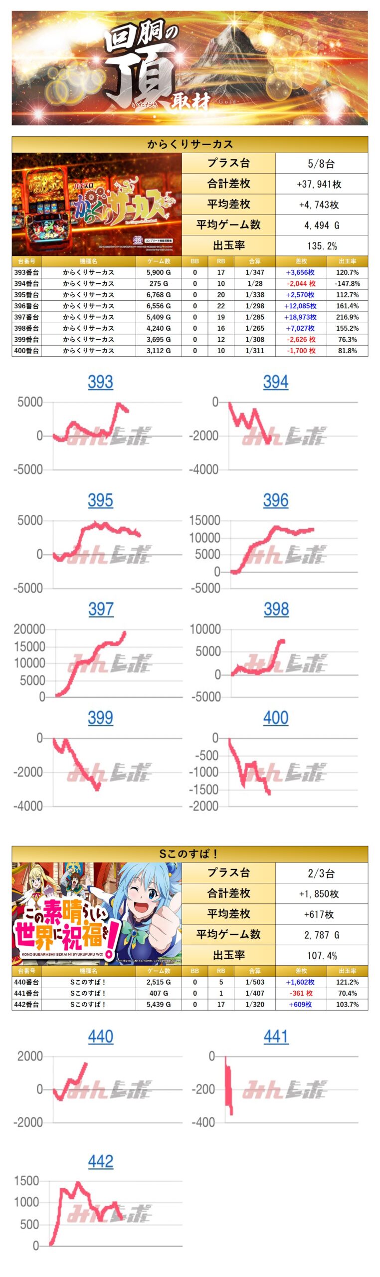 「からくりサーカス」「Sこのすば」の2機種をpick upする。2機種11台の平均差枚は+3,617枚で平均出率は129.9%だった。