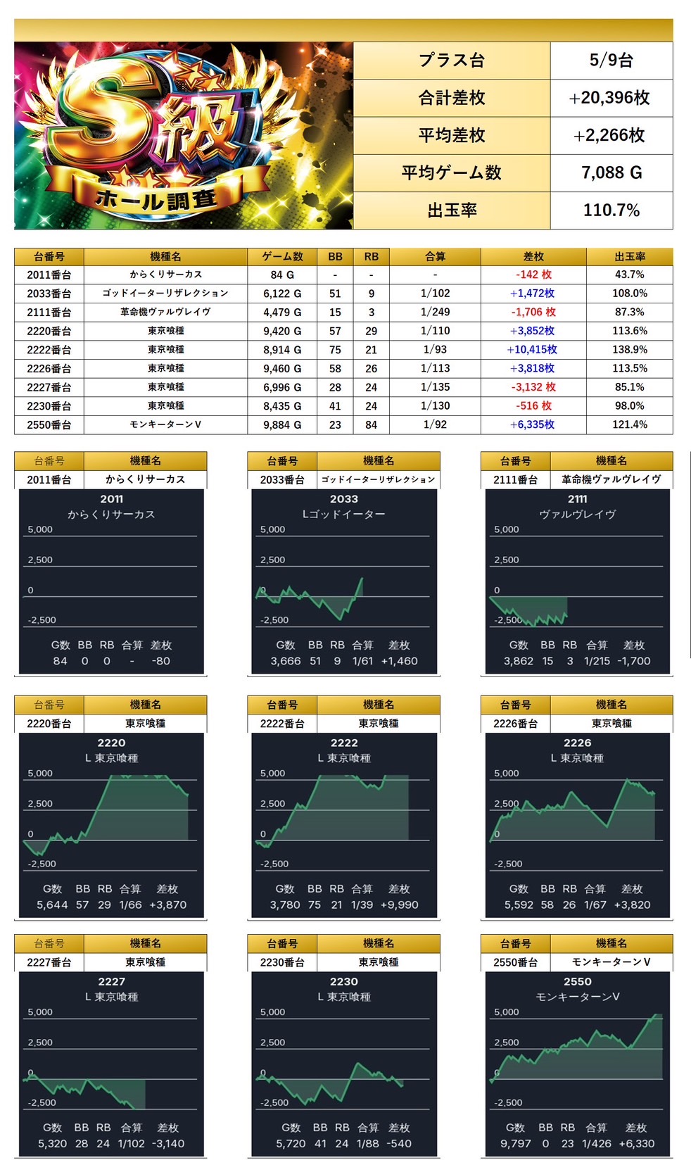 スマスロ「東京喰種」や「ヴァルヴレイヴ」、さらには「からくりサーカス」など9台がピックアップされ、平均差枚+2,266枚/出率110.7%を記録。メインらしい安定感を示した。
