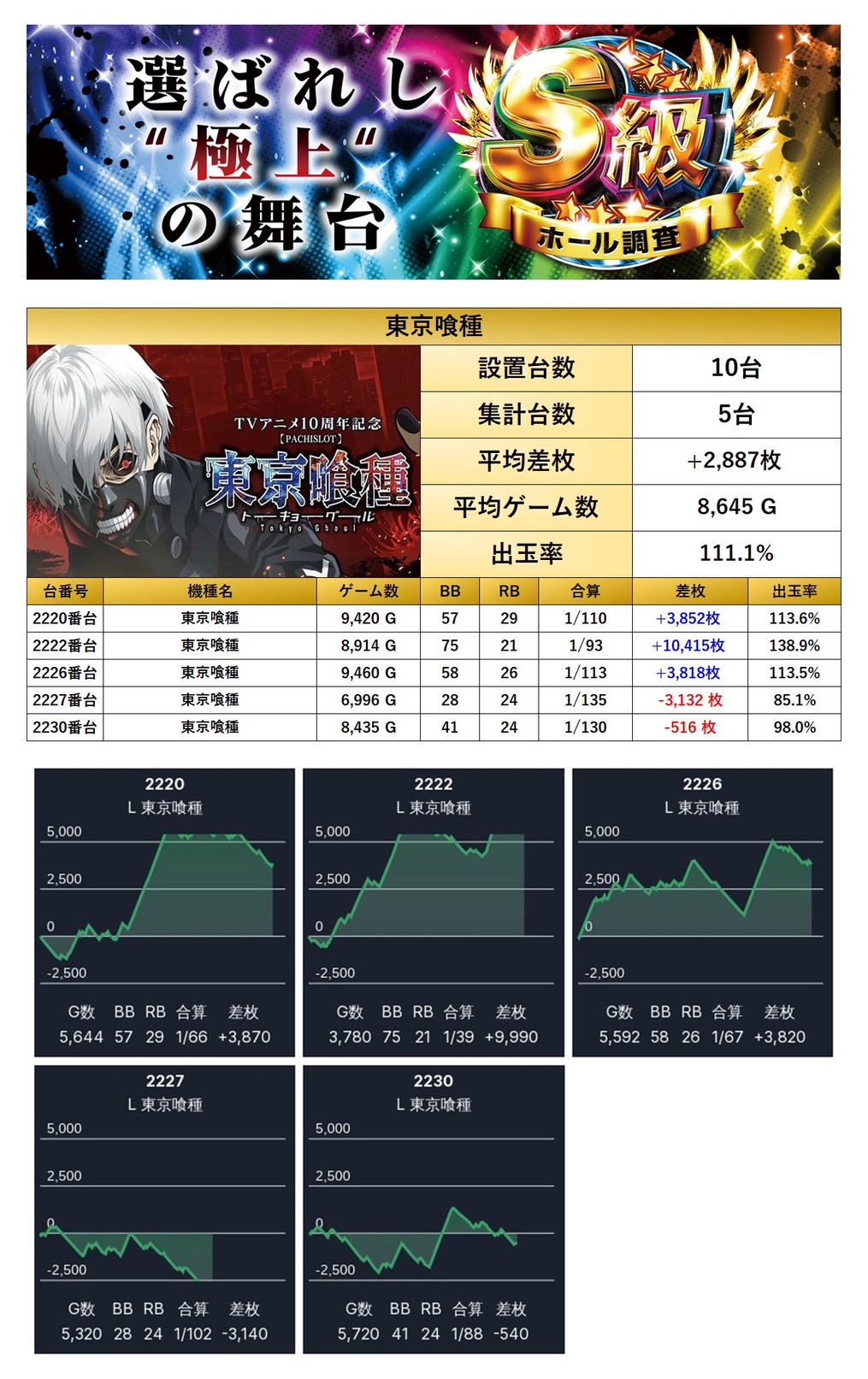 「人気機種からの仕掛け」や「ニブイチの東京喰種」が強さを発揮しつつ、「並び」や「4台設置機種」にも広くチャンスが散りばめられていたのが印象的。