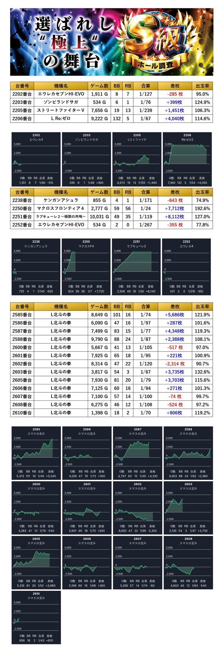今回のS級ホール調査-虹-は、総差枚+39,522枚/平均+103枚 を記録し、1ヶ月ぶりの開催を二ツ星評価で締めくくった。