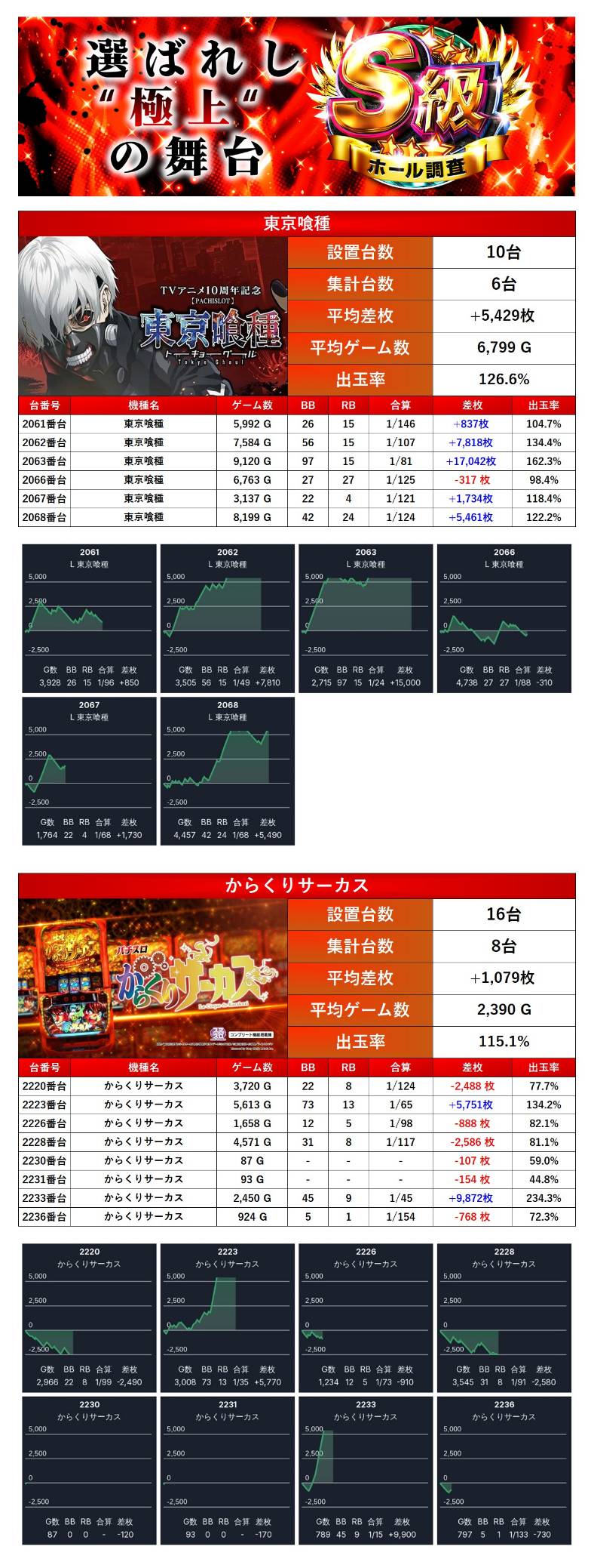「東京喰種」「からくりサーカス」の2機種をpick upする。2機種14台の平均差枚は+2,943枚で平均出率が122.9%であった。