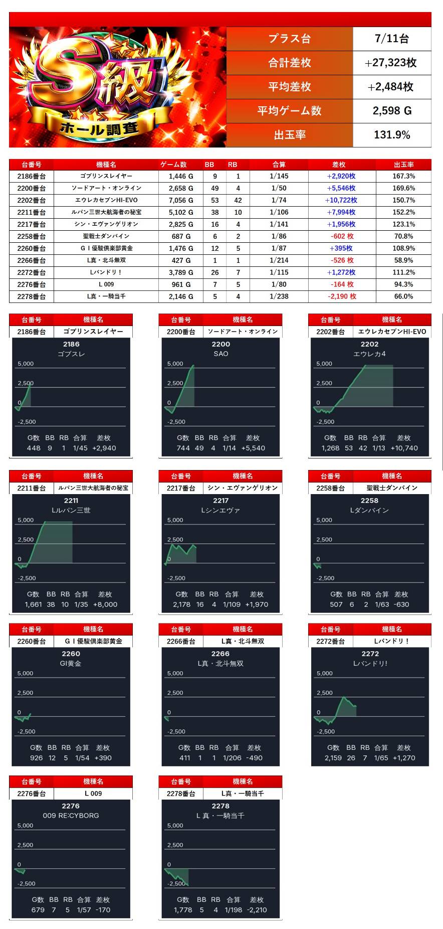 対象から11台をpick upする。11台の平均差枚は+2,484枚で平均出率が131.9%だった。