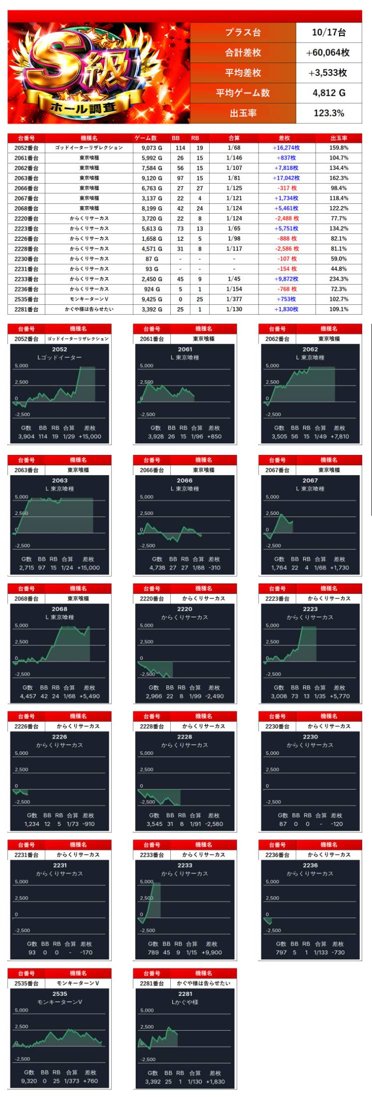 17台の平均差枚は+3,533枚で、平均出率は123.3%だった。