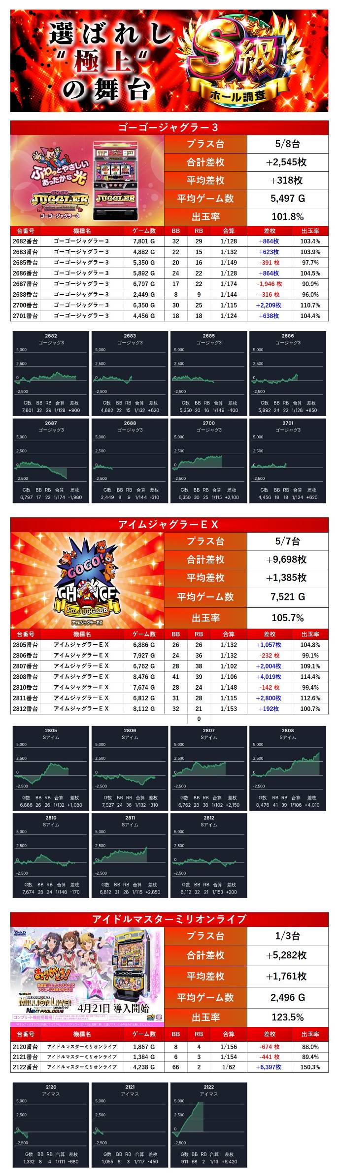 「ゴージャグ」「アイム」「アイマス」の3機種計18台をpick up。3機種18台の平均差枚は+974枚で平均出率が105.2%であった。