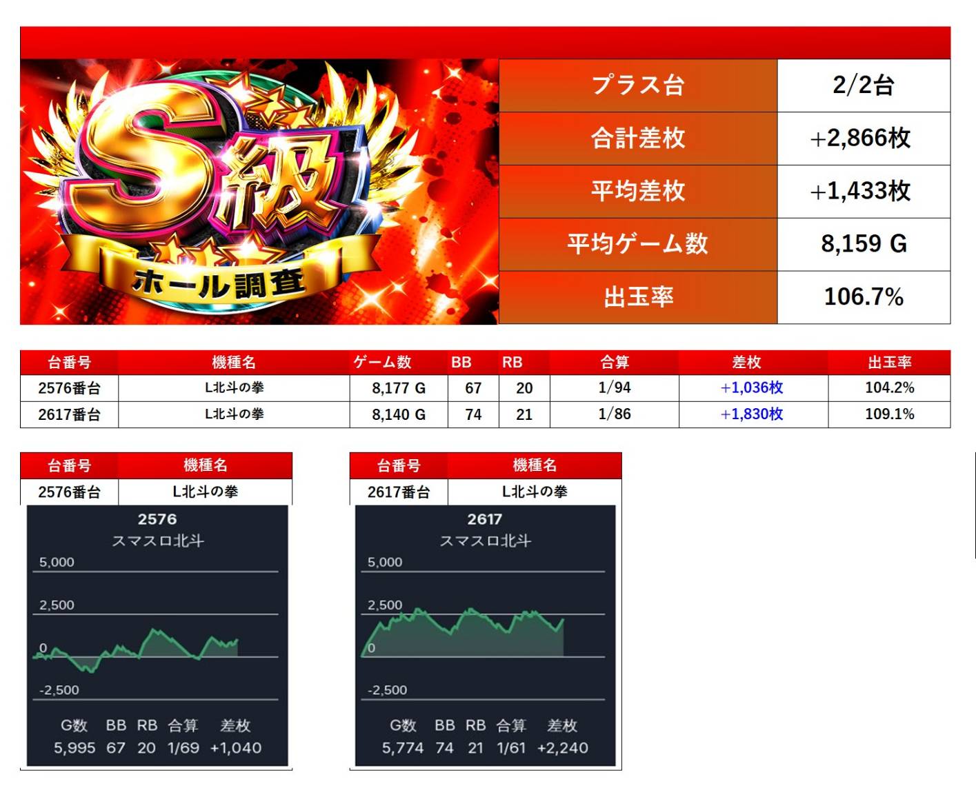 全体から2台がpick up。2台の平均差枚は+1,433枚で、平均出率は106.7%となった。