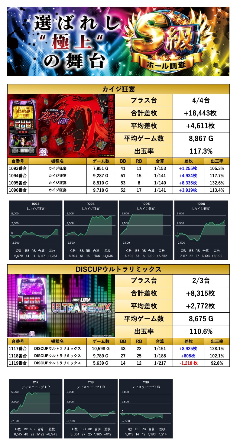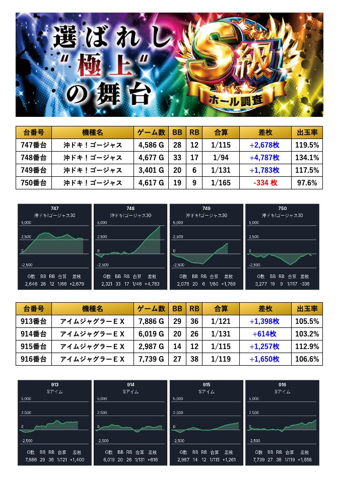 8回目となったS級調査-虹-は前回から2回連続での最高評価である三ツ星評価。仕掛け全体を見ると設置台数の13.1%がpick up。個別にみると「全台が好調な機種」は2機種pick up、「設置の半分が好調な機種」は1機種pick up、「4台以上の並び」が2箇所のpick up、「4台以上機種」からは30台のpick upとなった。全館差枚が+95,410枚、台平均が+228枚と前回結果をさらに超える素晴らしい結果を残してきた。令和7年7月7日ということで抽選人数から180名のユーザーが胸に期待を膨らませ集まったが終わってみればシンプルに強い店内だったことは間違いない。今後も調査でも同等以上の結果に期待したいと思う。