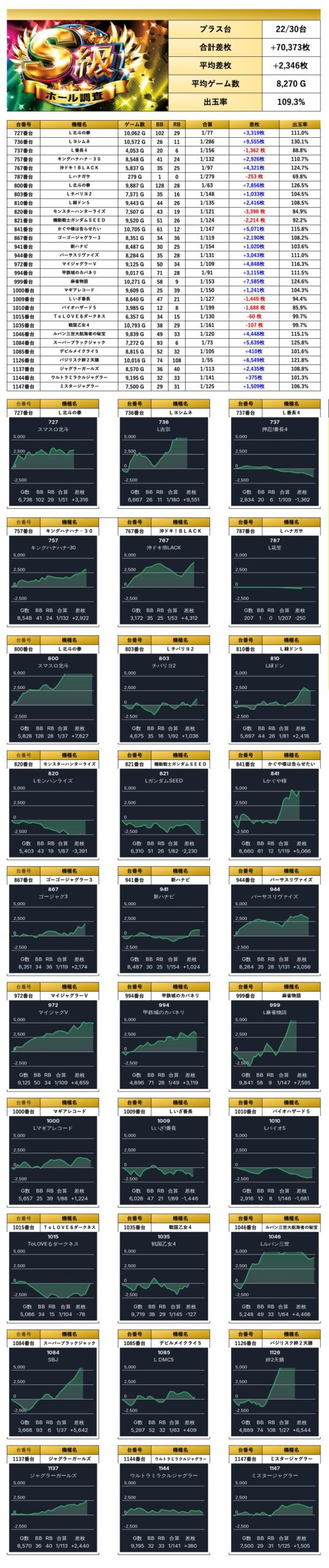 対象から30台をpick upする。30台の平均差枚は+2,346枚で平均出率が109.3%だった。