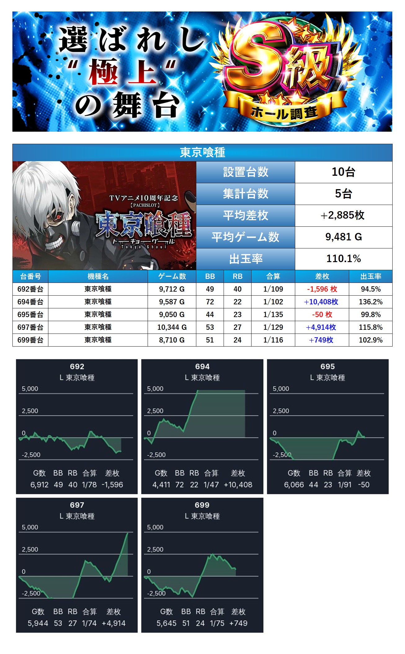 優秀台でも紹介した「東京喰種」の1機種をpick upする。1機種5台の平均差枚は+2,885枚で平均出率が110.1%だった。
