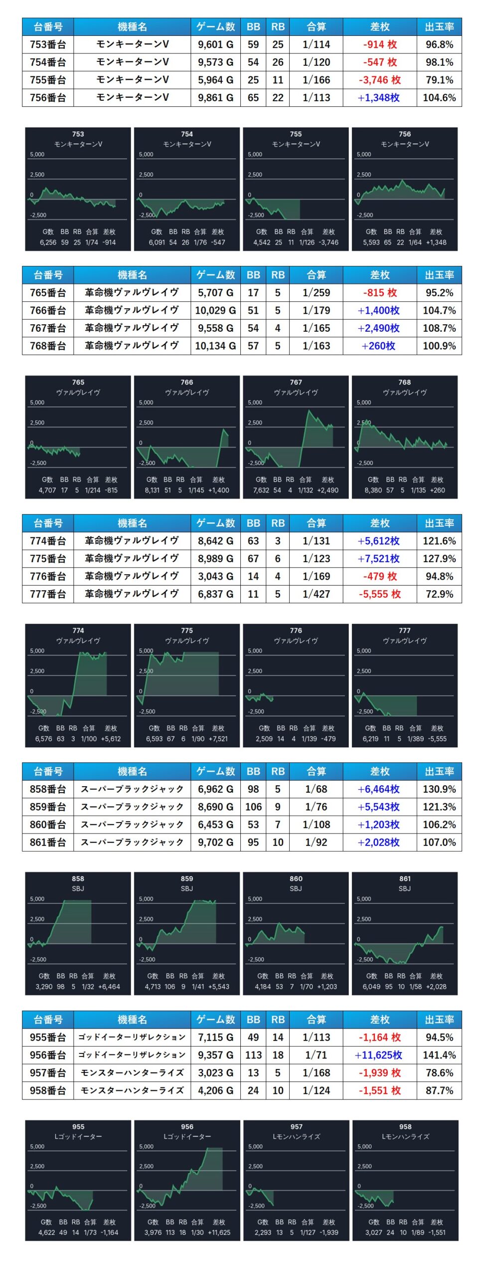 4台並びを9箇所、合計36台をpick upする。平均差枚+1,535枚・平均出率106.7%と盛り上がりを演出した。