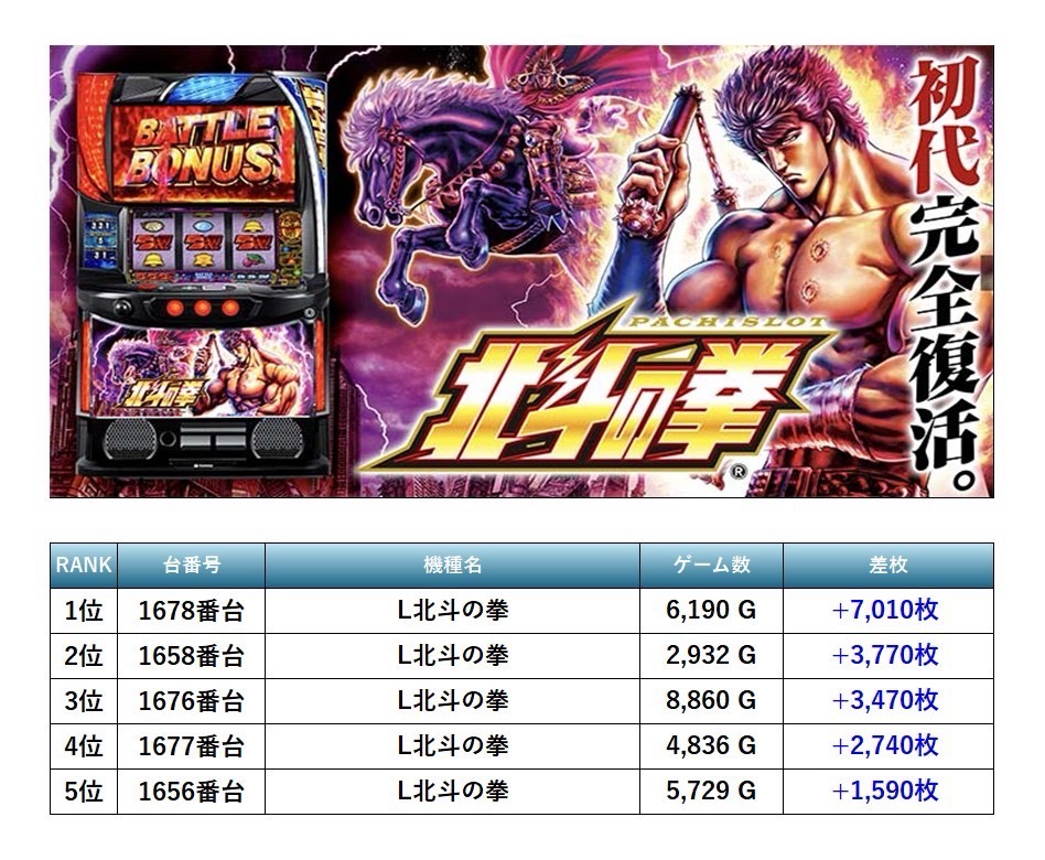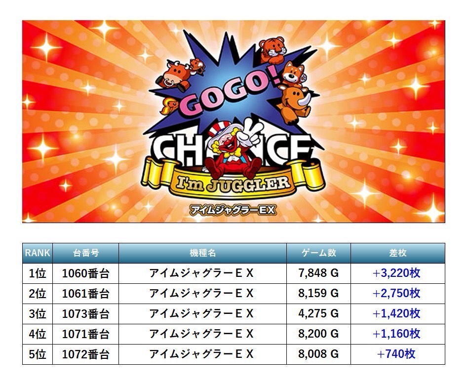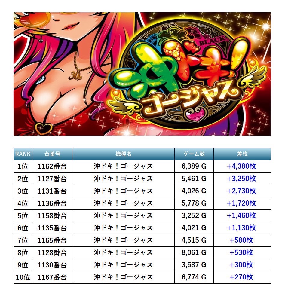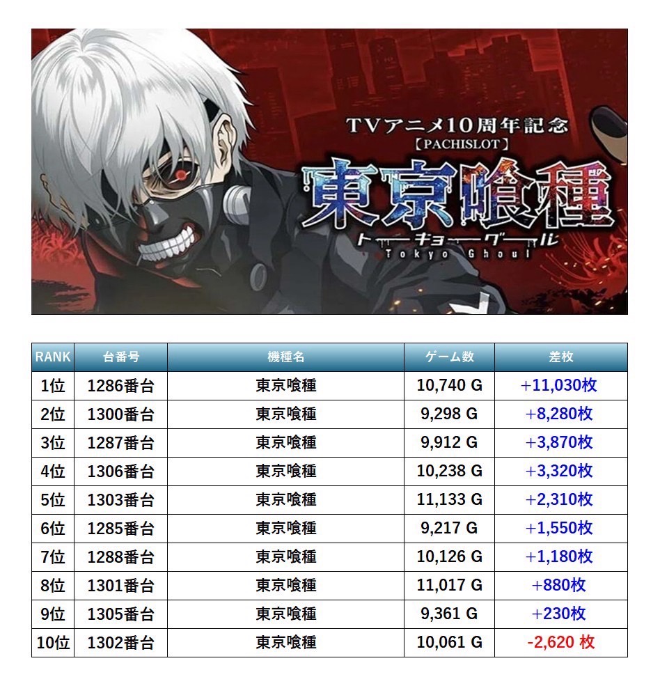 13回目となったSMART SLOTTER来店取材にはこの日は7月7日ということもあり、抽選から204名ものユーザーが訪れた。7機種もの仕掛けがpick upとなった。pick up機種は「東京喰種」「マイジャグ」「沖ドキ」「北斗の拳」「モンキーターン」「ヴヴヴ」「アイムジャグラー」と多彩な仕掛けだった。特に際立っていたのは「東京喰種」については全台調子が良さそうだ。「マイジャグ」についてもしっかりとした出玉がついていて店内全体に盛り上がりが見られた。次回の取材も期待している。