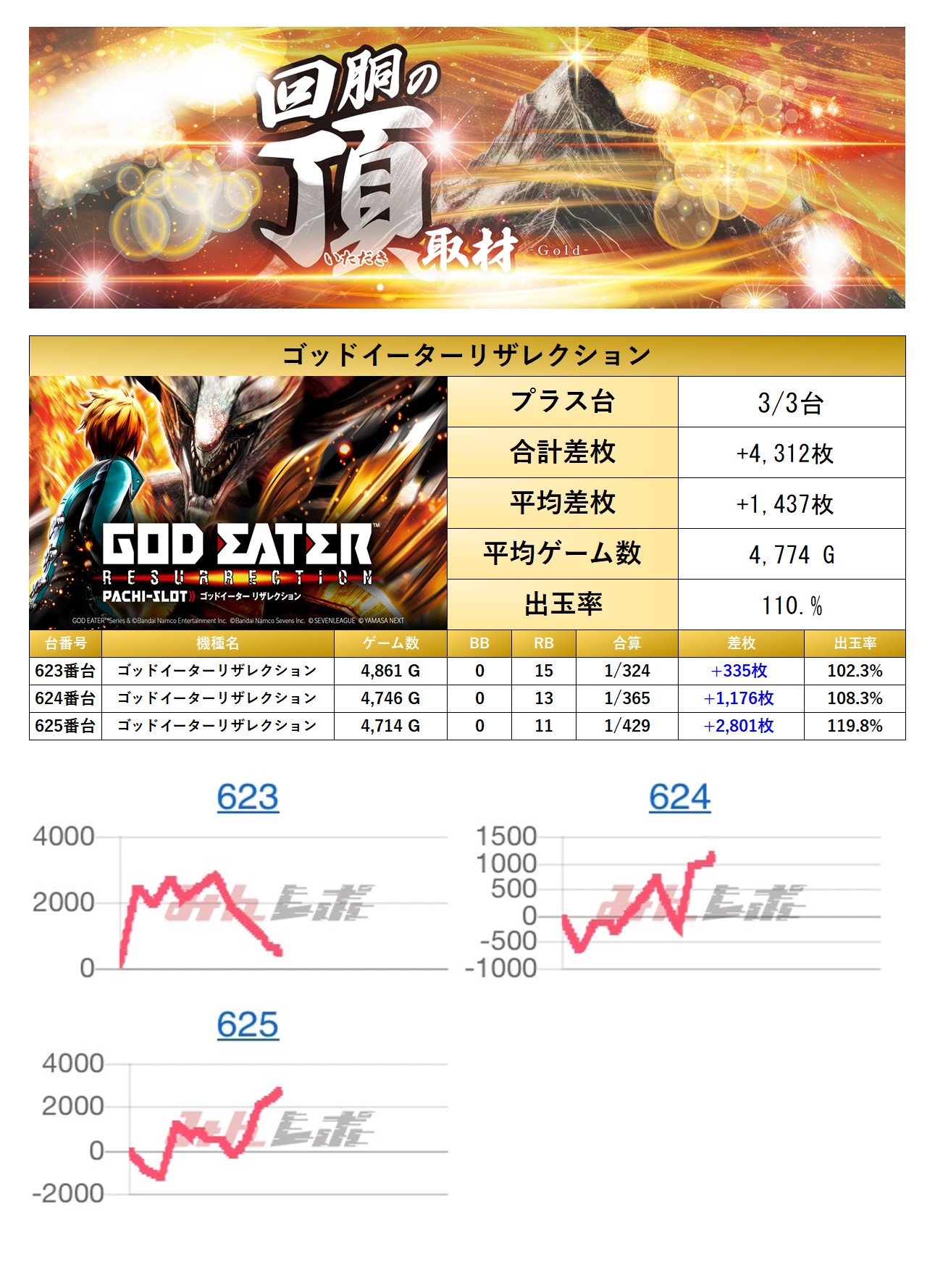 「ゴットイーター」の1機種をpick upする。1機種3台の平均差枚は+1,437枚で平均出率は110.0%だった。