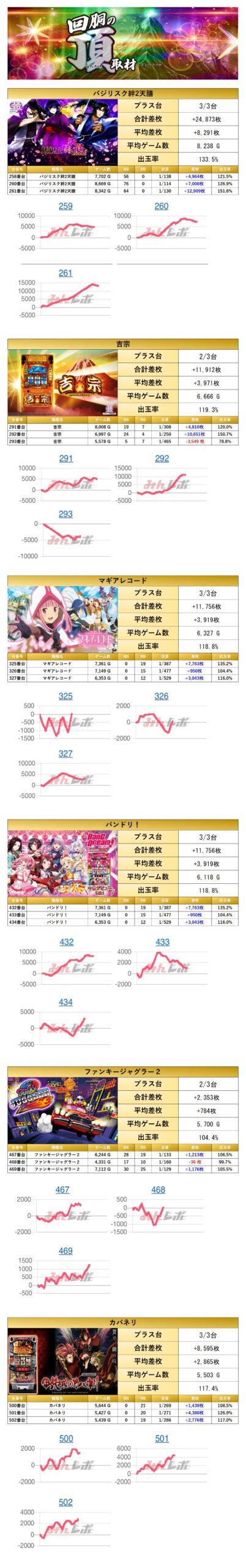 「バジリスク絆天膳」「L吉宗」「マギレコ」「バンドリ!」「ファンキージャグラー」「カバネリ」の6機種をpick upする。6機種18台の平均差枚は+3,958枚で平均出率が119.6%だった。